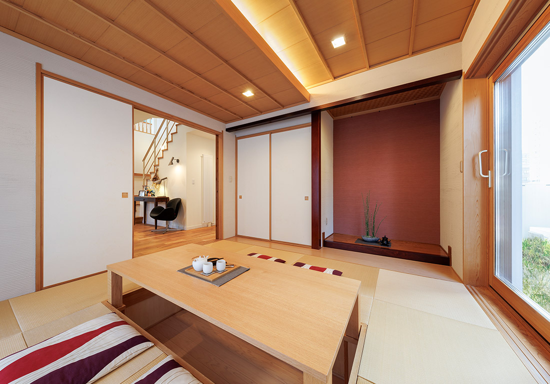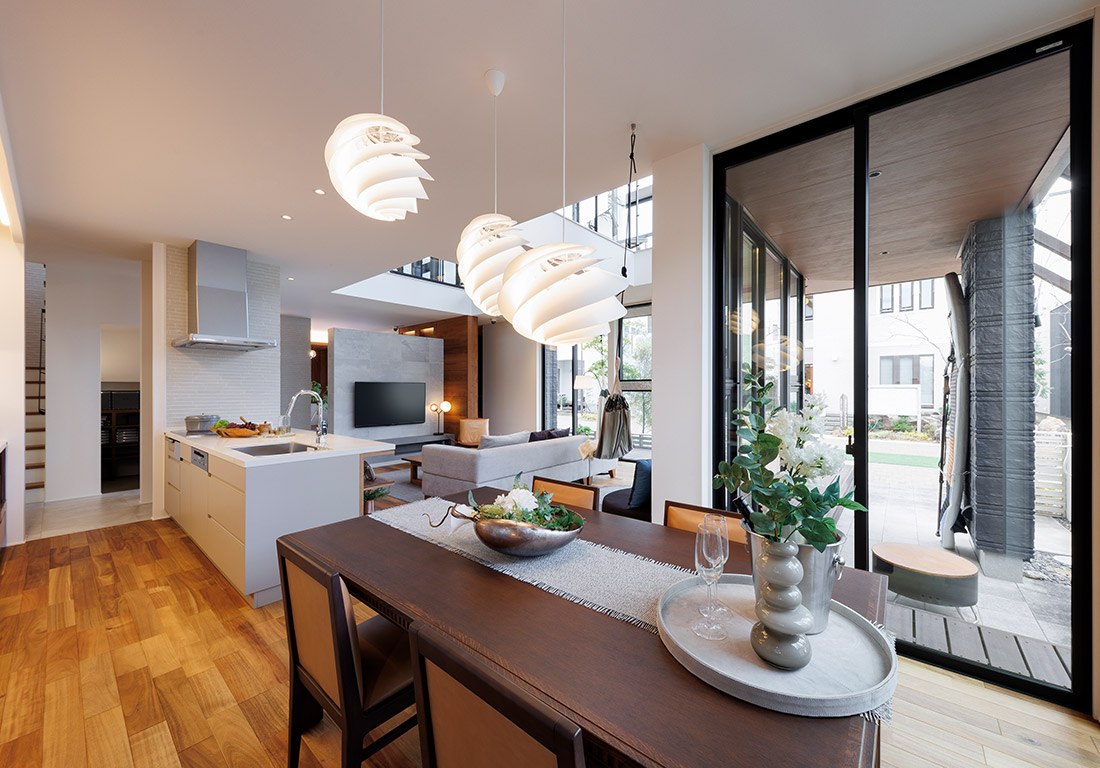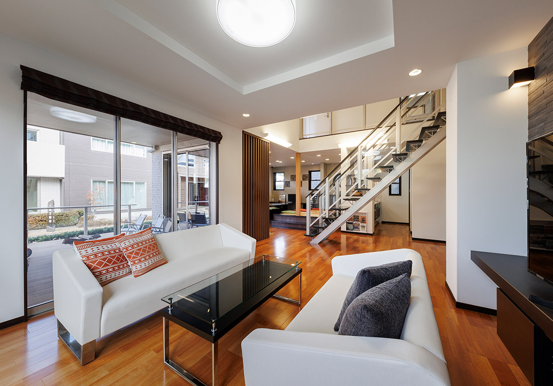 間に天井や床をつくらず、下から上まで二階以上突き抜けてつくられた空間。開放的な空間が生み出すことができ、光を取り入れることや、風の通り道をつくることもできる。
