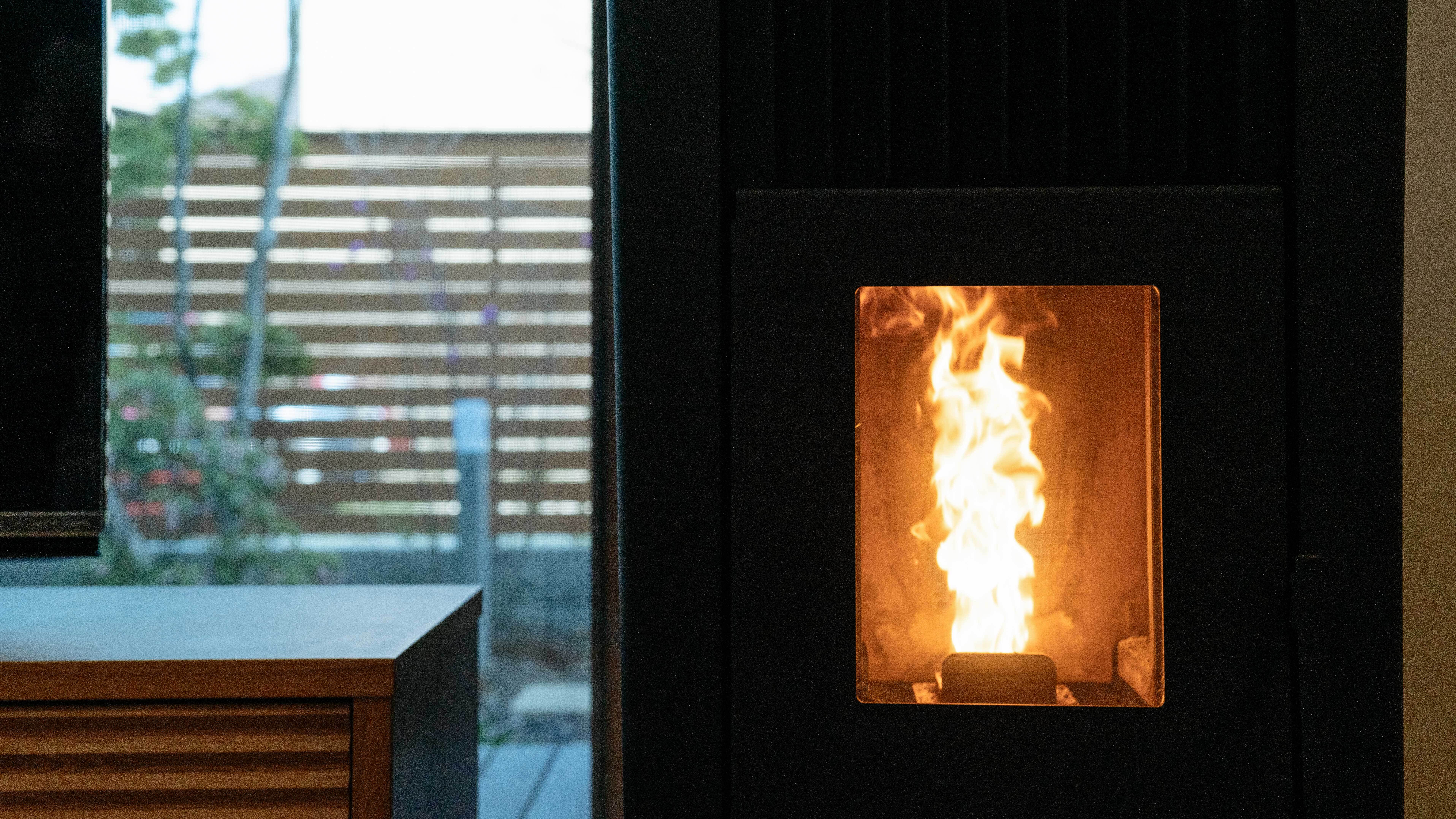土間リビング:薪ストーブのある土間部分は家族が集う憩いの場に。