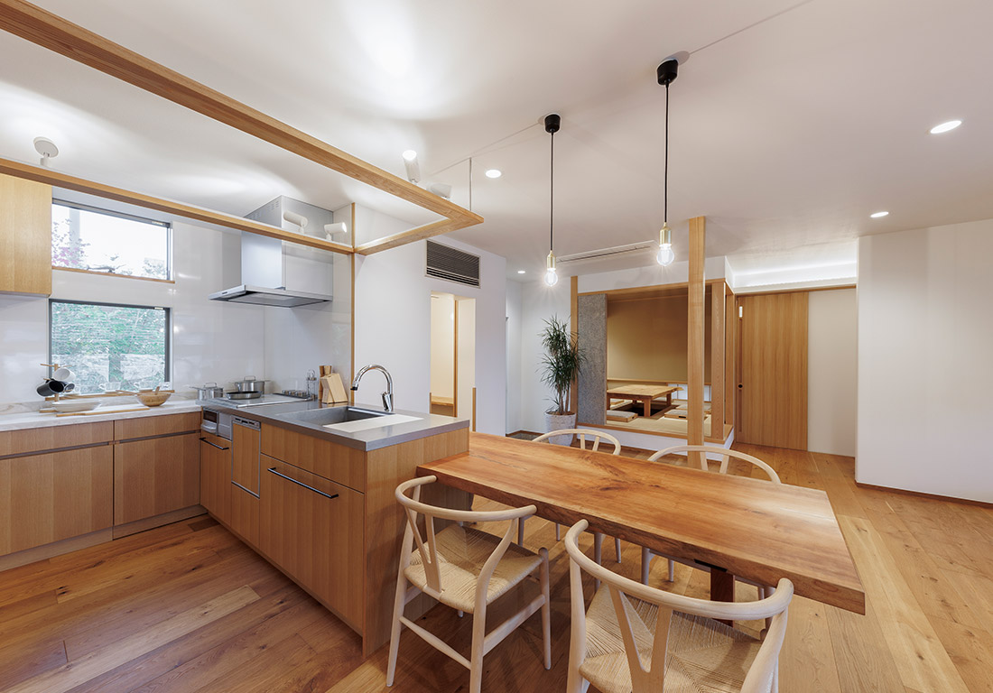 天然木のキッチンカウンターや洗面台等、無垢のぬくもりを感じる注文住宅仕様。