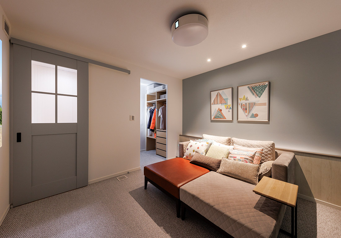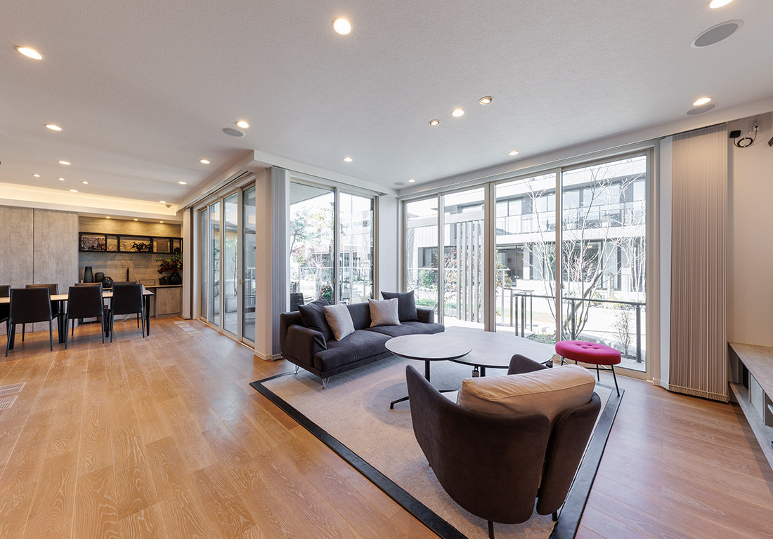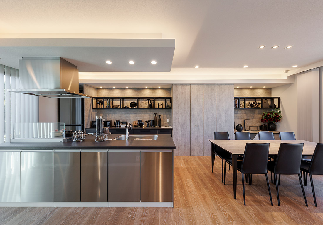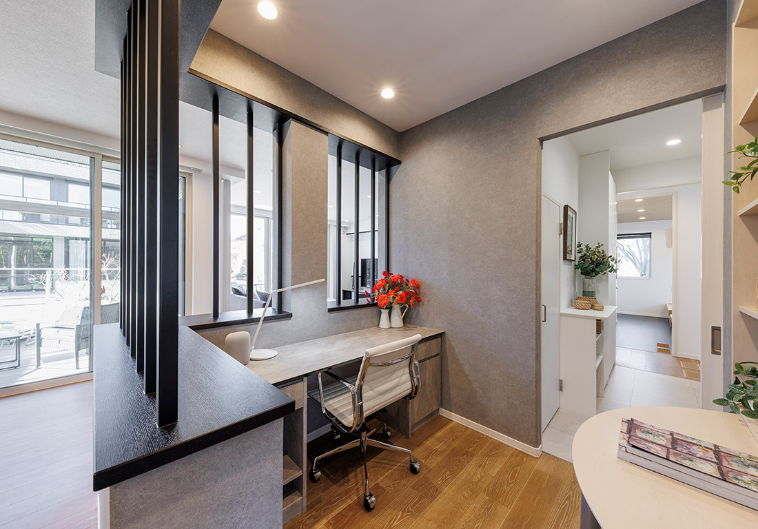 家事負担を軽減する工夫や、鉄骨ラーメン構造を活かした広々空間が魅力の展示場。洗練されたデザインと快適な暮らしを両立した、ご多忙な夫婦様にも喜んでいただける展示場でございます。