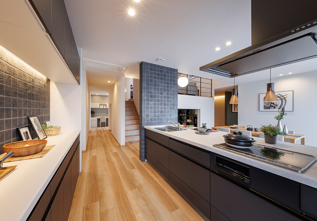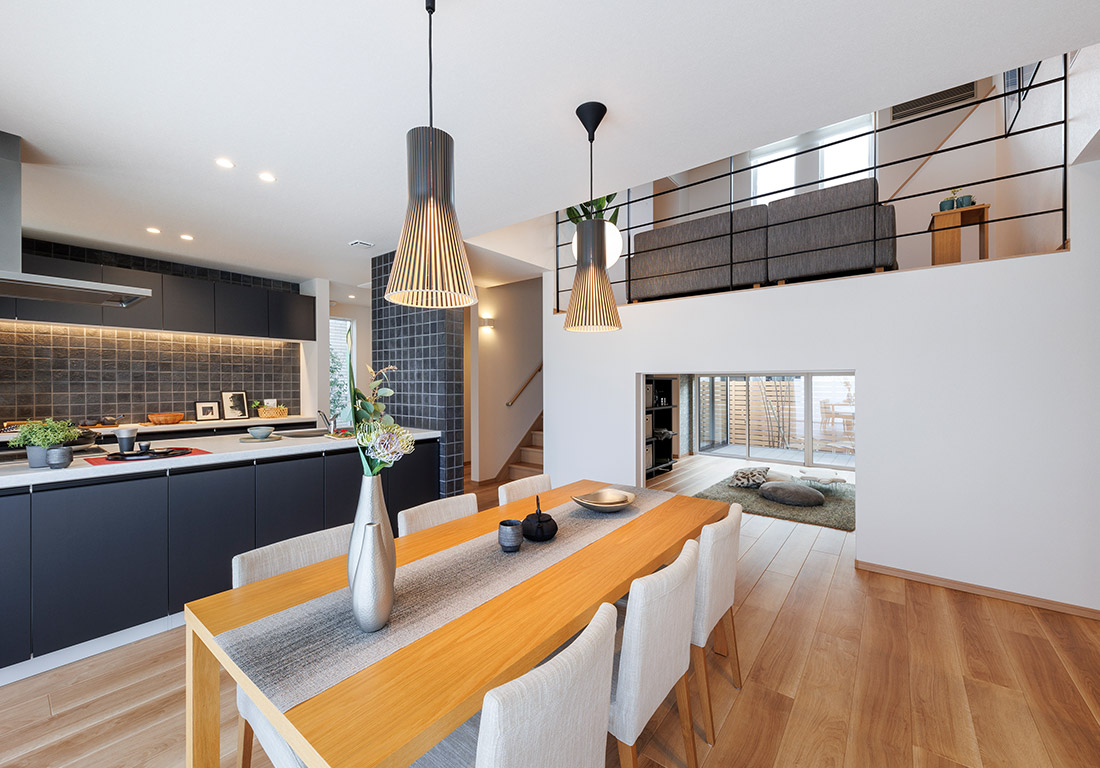 和モダンな外観と吹き抜け・スキップフロアを生かした開放的な空間が特徴。動線や収納にもこだわり、家族の暮らしやすさを体感できるモデルハウスです。