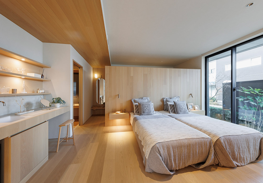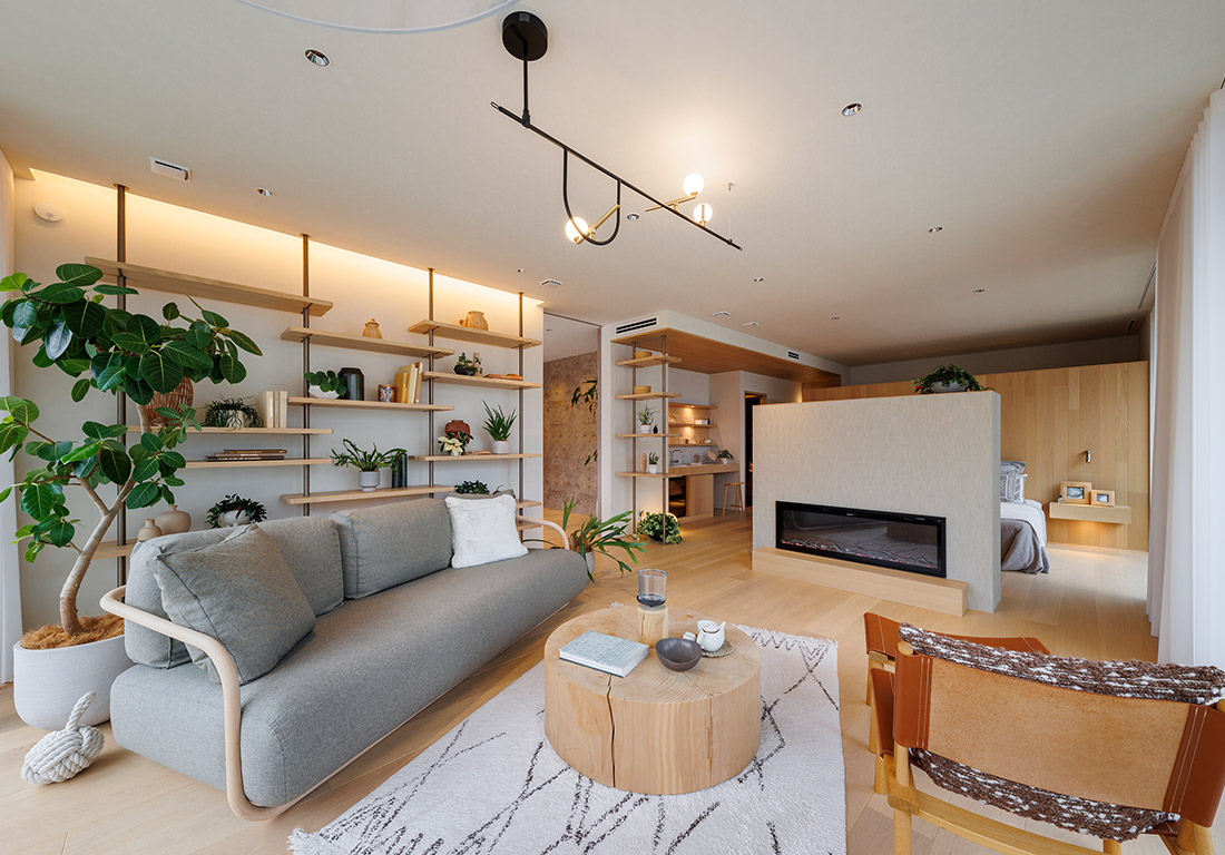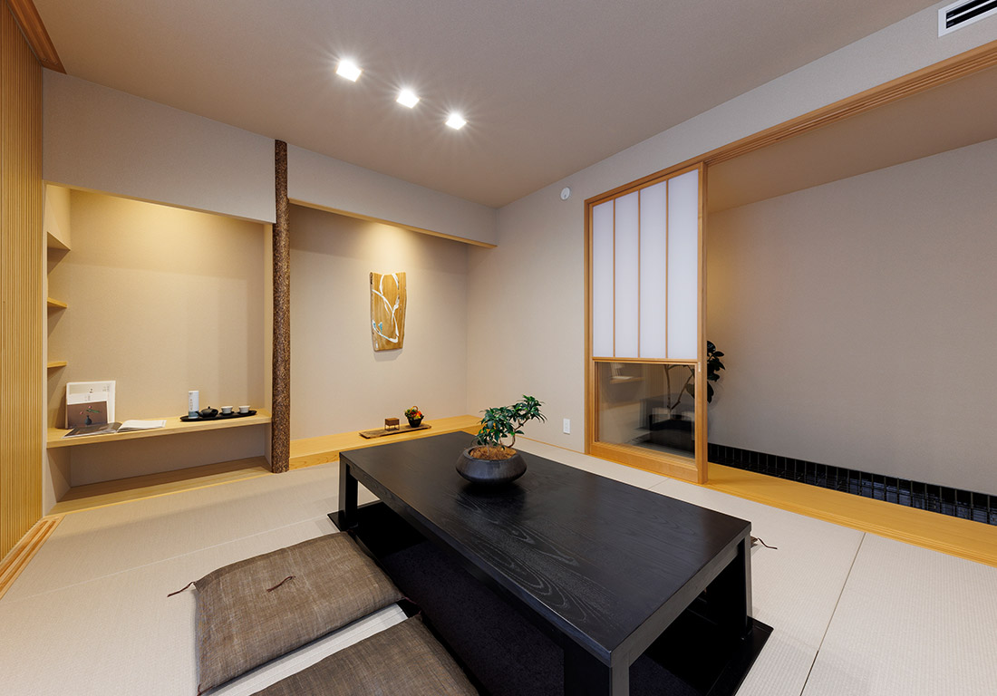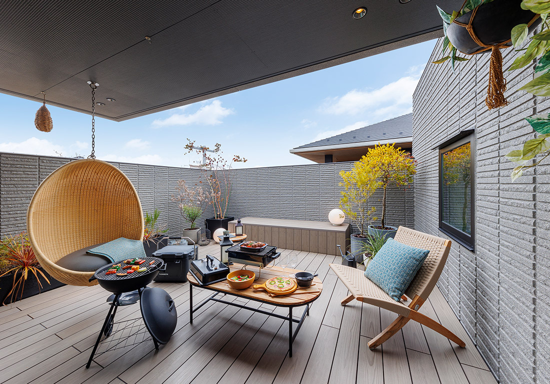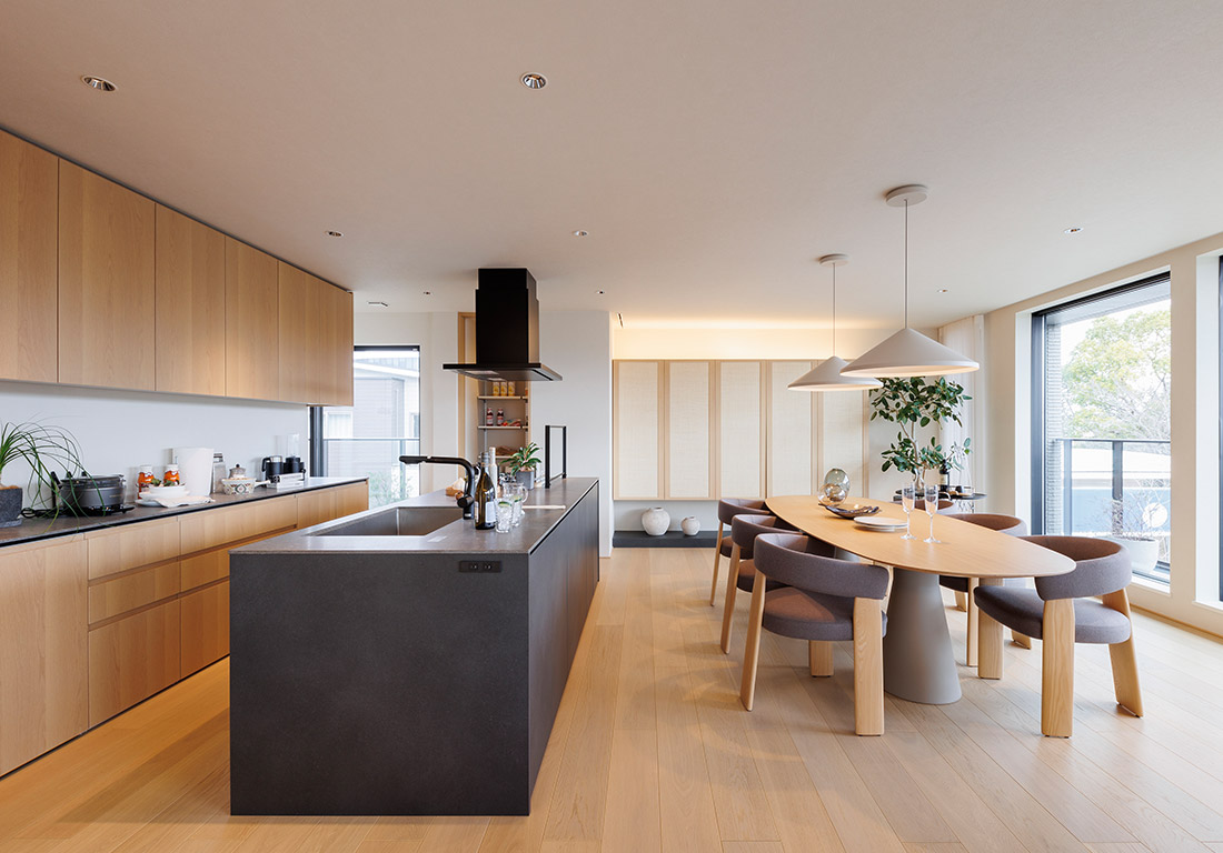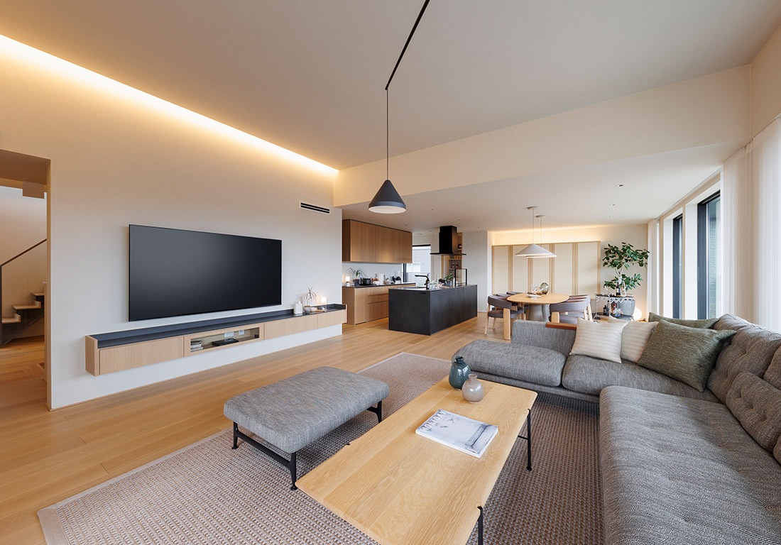 重量鉄骨ならではの強靭な躯体が実現する約36帖の無柱空間リビングに加えて24時間どこにいても快適に生活できる全館空調を採用。LDKから見える中庭は凉しい季節のBBQや月夜に晩酌、朝はコーヒーを嗜む空間に最適です。