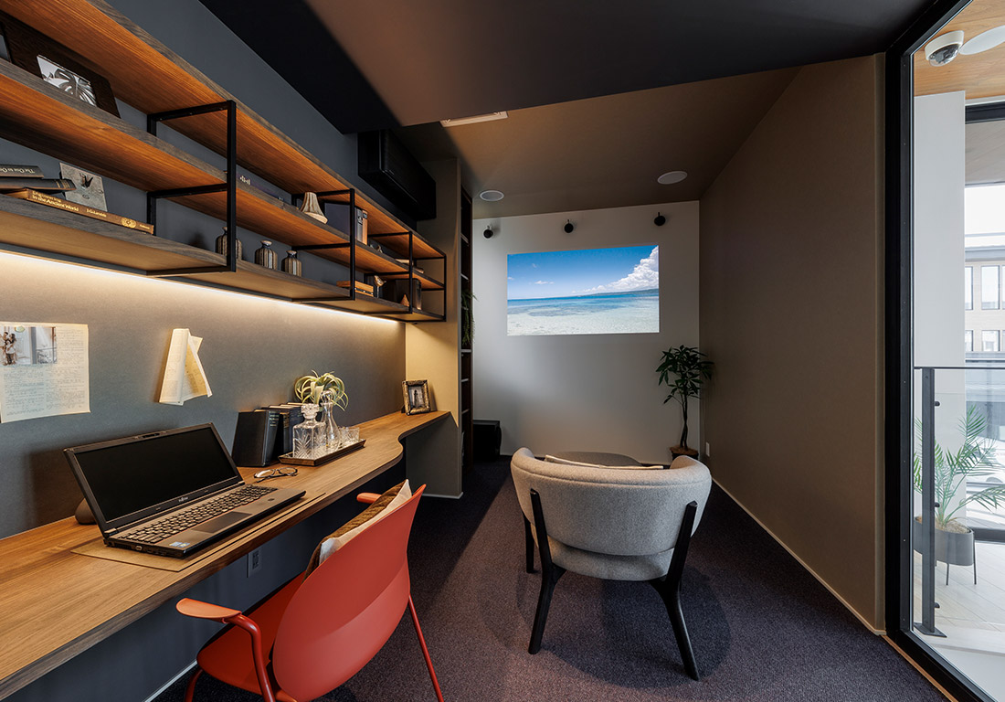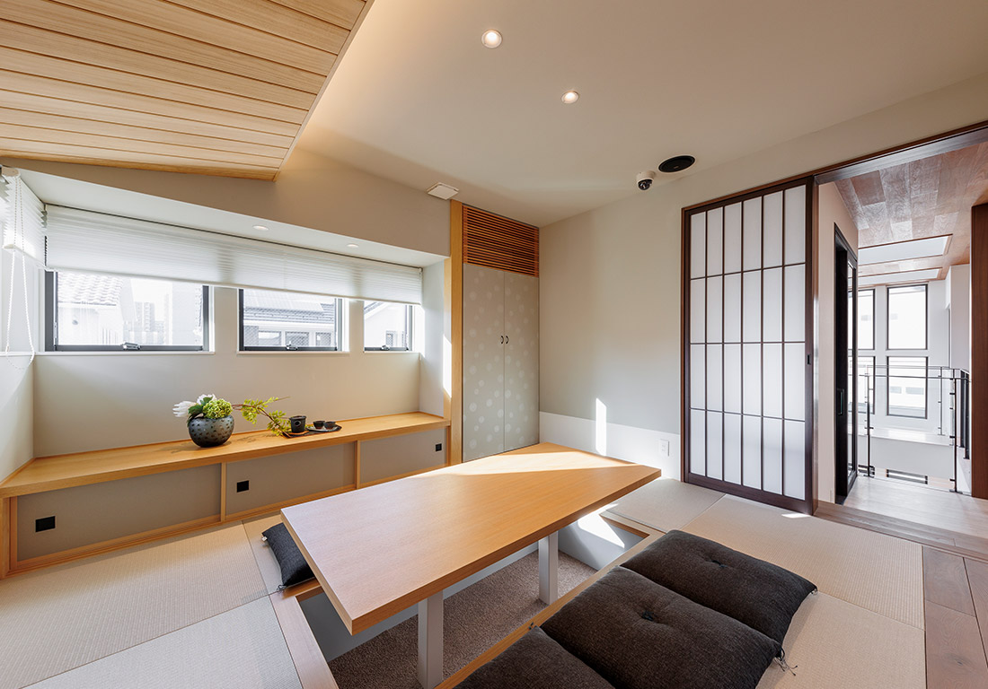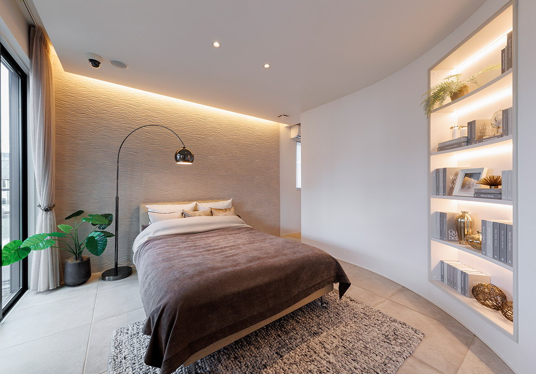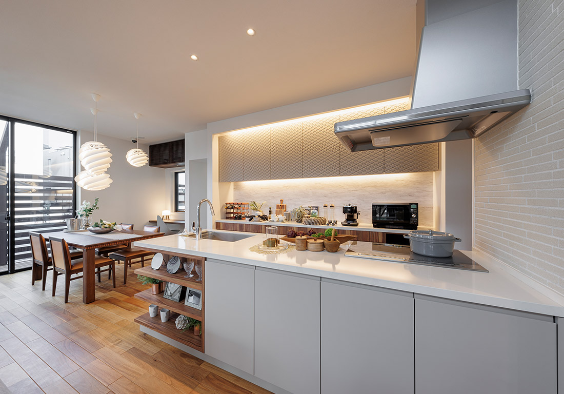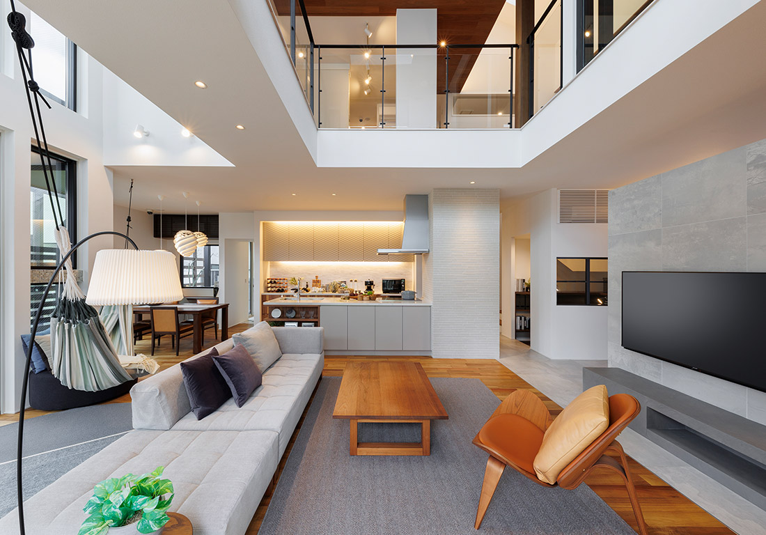 コーナー部分に大きな開口を設けたダイナミックな外観。天井高が高く伸びやかで開放的なLDKと軒下のコの字型デッキでは、同じ趣味を持つ仲間が集い、アクティブな休日を過ごすことができます。