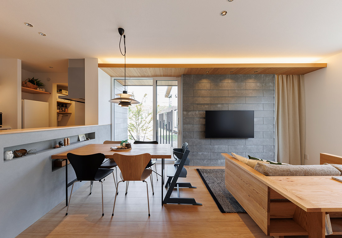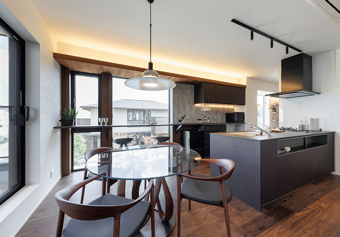 当社で一番断熱性能の高い「+℃ermo7G」で断熱等級7という高断熱・高気密を実現しています。大きく設けた窓から外部の景観を楽しめるように仕上げ、室内からも自然を感じられる心地よい空間になっており、性能からデザインまで見どころたっぷりのモデルハウスとなっています。