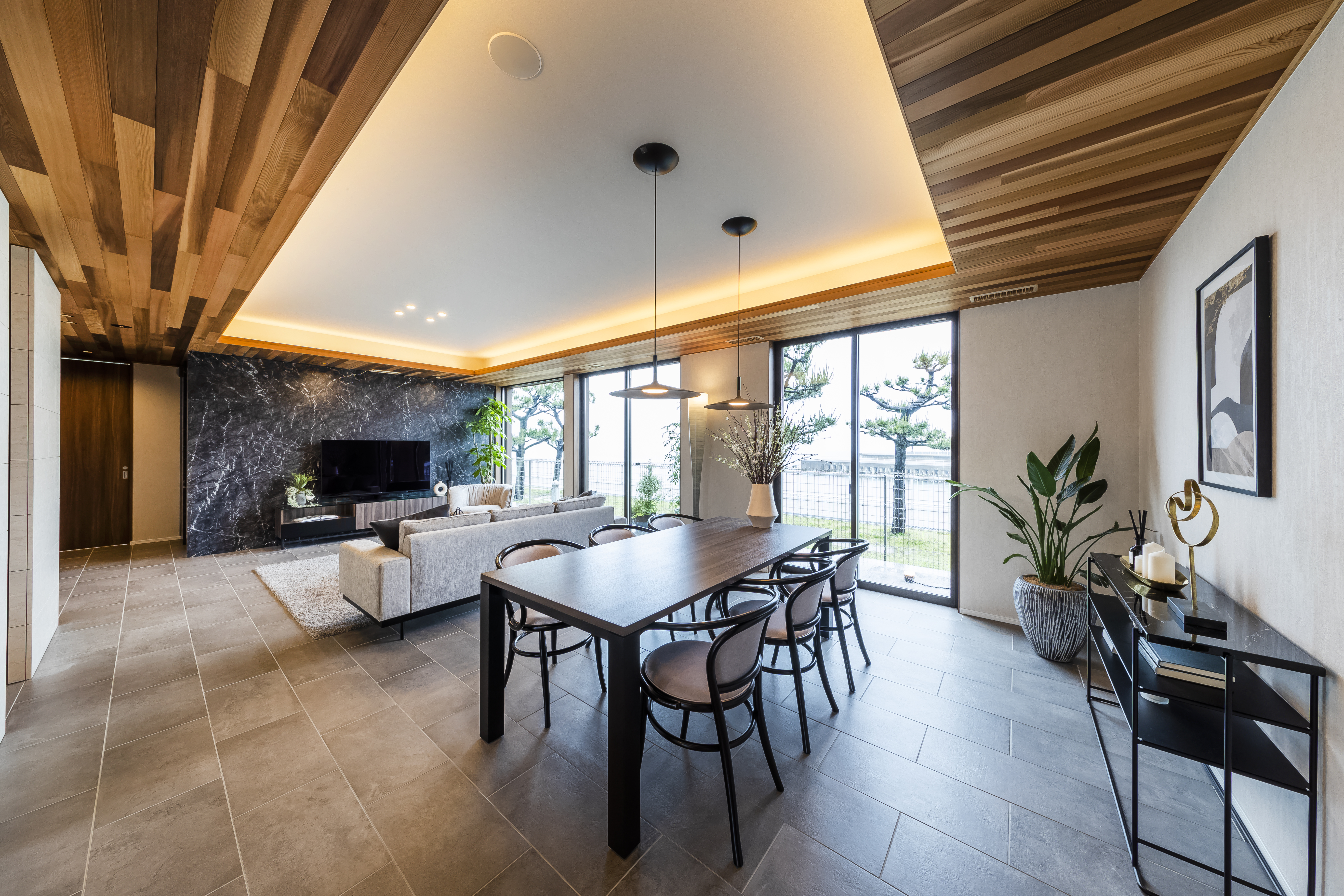 “木×石”をコンセプトとしたリビングは、上品でお洒落な空間でを演出できるだけでなく、自然の温もりも感じられます。