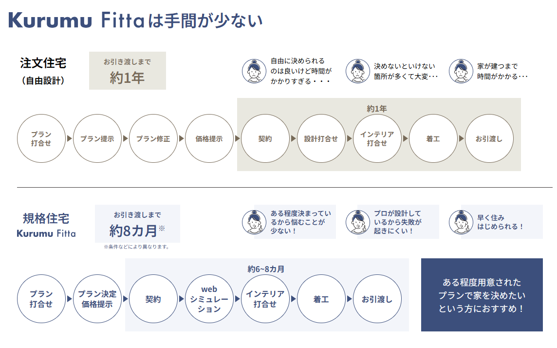 間取り・インテリア・設備を選ぶだけで、すぐに着工。 打合せを少なくし、 手間をかけず負担が少ない、 これが「Kurumu Fitta」のメリットです。