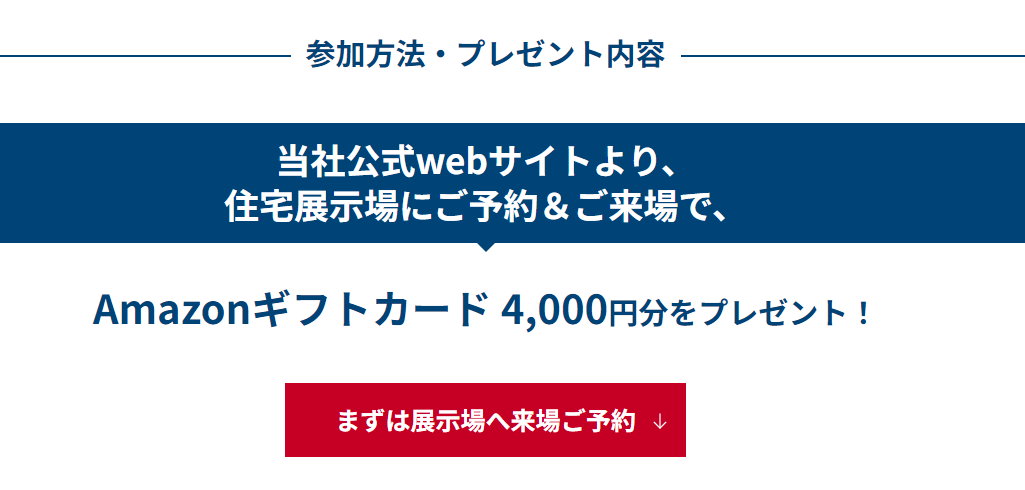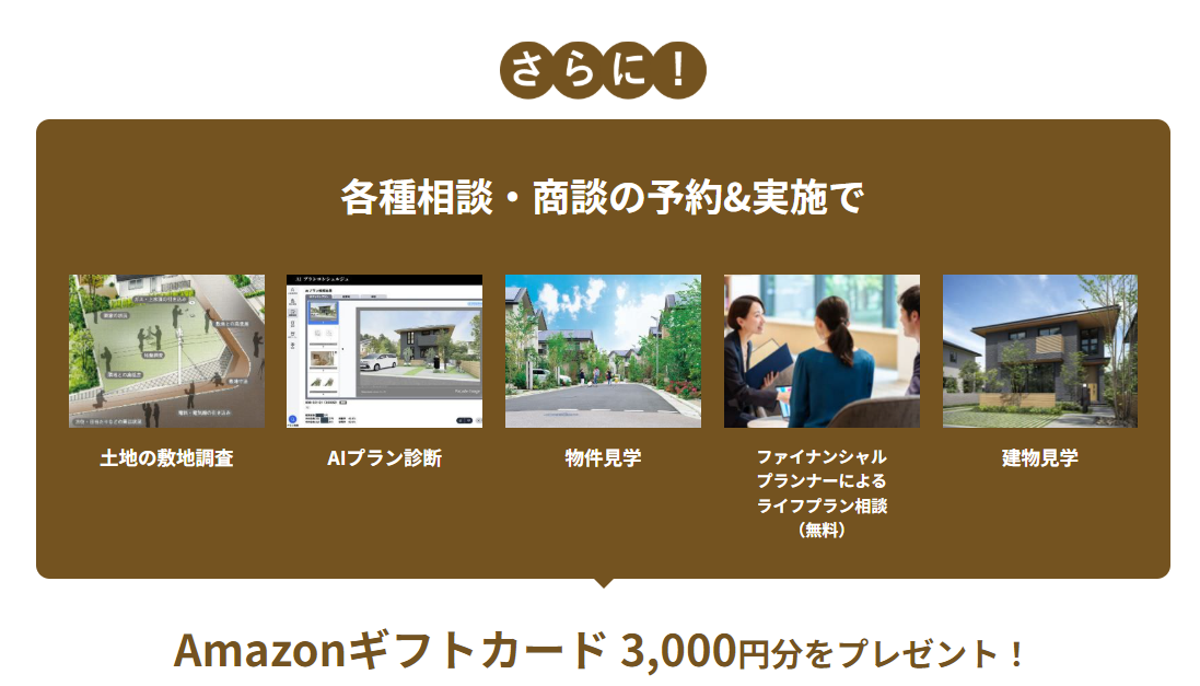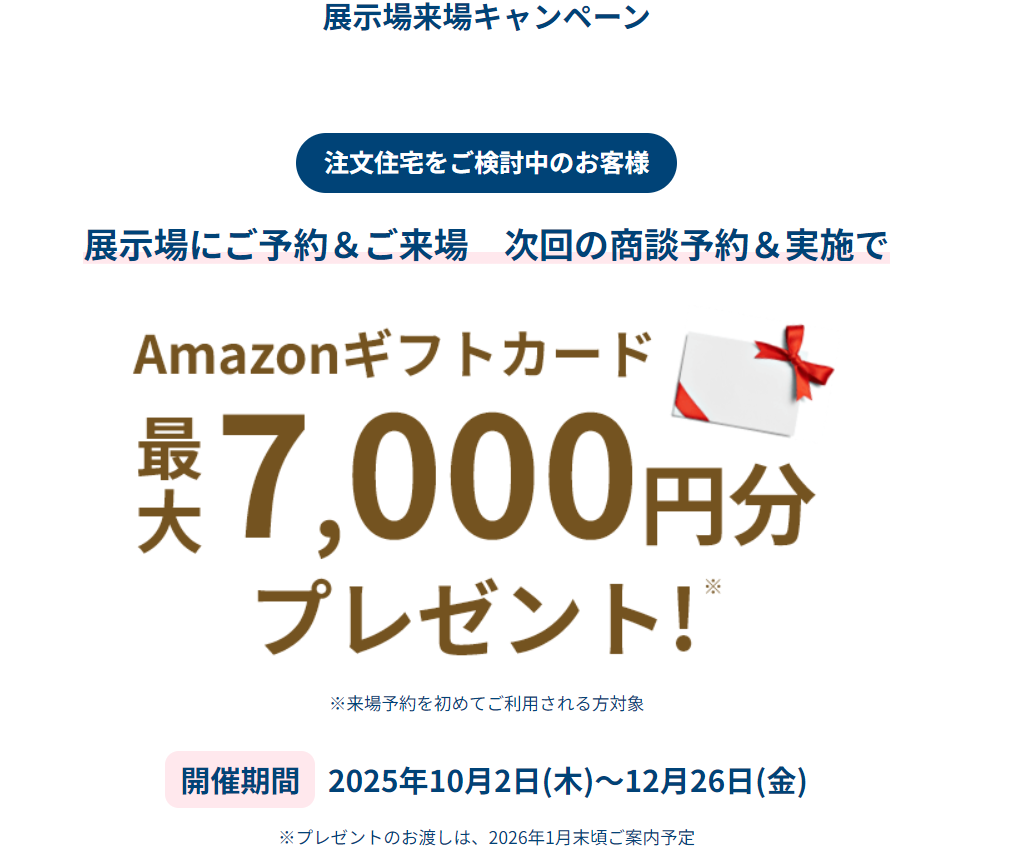 - ※大和ハウスの公式WEBサイトから「住宅展示場」にご予約の上、ご来場いただいた方には「Amazonギフトカード4,000円分」をプレゼント。さらに、各種相談(AIプラン診断、ファイナンシャルプランナーによるライフプラン相談(無料)、土地の敷地調査、物件見学、建物見学)の次回の商談を予約&実施いただいた方には「Amazonギフトカード3,000円分」をプレゼントします。展示場にて当社営業担当が専用のプレゼント応募フォームをご案内しますので、Amazonギフトカード送信用の情報を登録していただきます。また、大和ハウスより、ご登録いただいたメールアドレス宛に、2026年1月末頃を目途にプレゼント受け取り用URLをご案内する予定ですが、状況によりご案内時期が変更となる場合がございます。