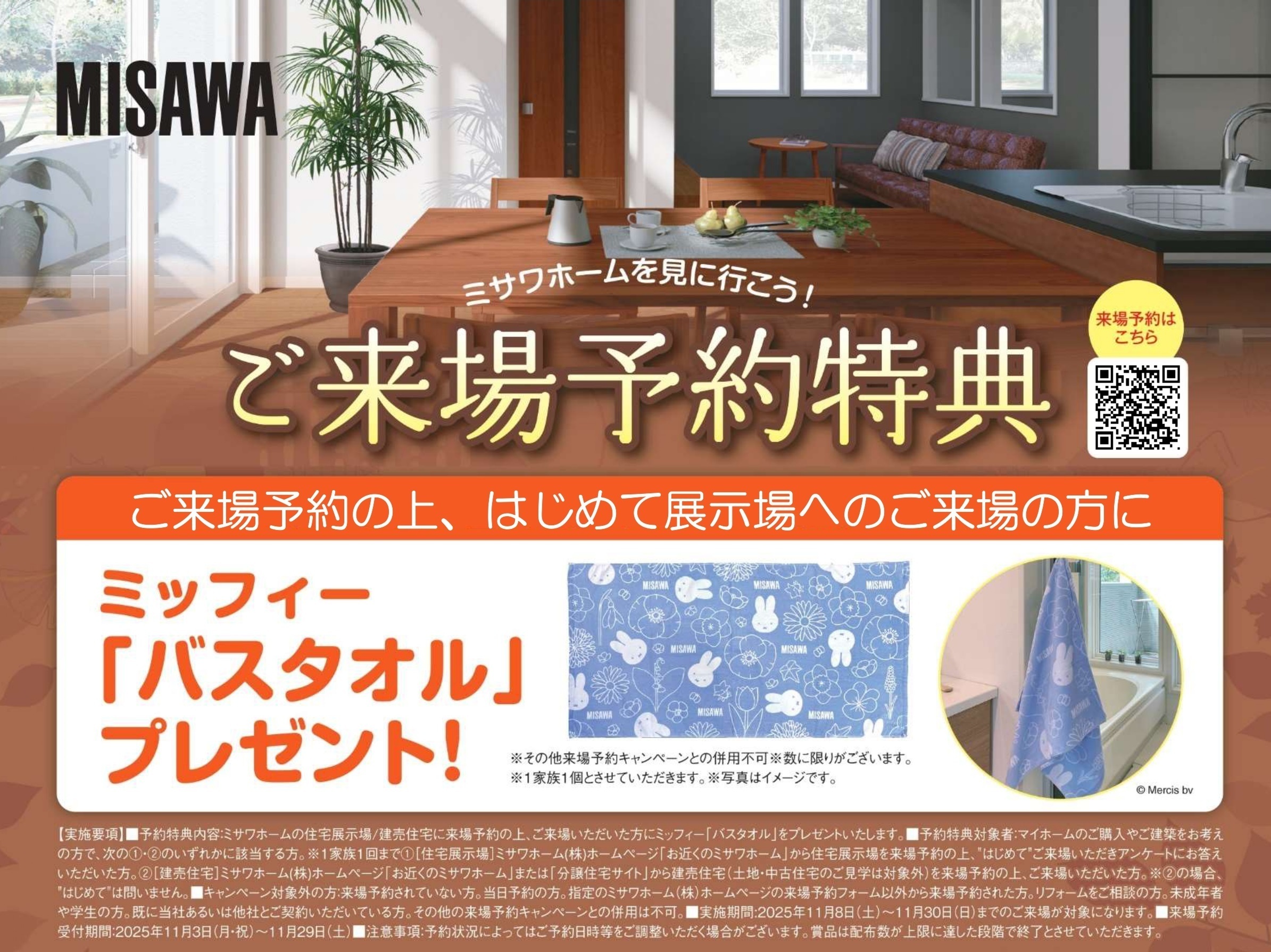 事前WEB予約の上、はじめて展示場見学の方に、ミッフィーオリジナルバスタオル&Amzonギフト3000円分プレゼント🎁🎁