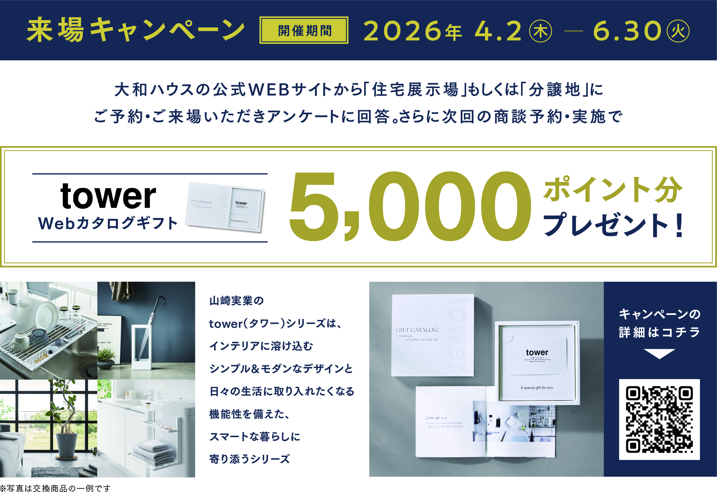 ● 2026年4月2日〜6月30日の期間中、大和ハウスの公式WEBサイトから「住宅展示場」にご予約の上、ご来場いただきアンケートに回答。さらに次回の商談を予約&実施していただいた方には「towerのWebカタログギフト5,000ポイント分」をプレゼントします。