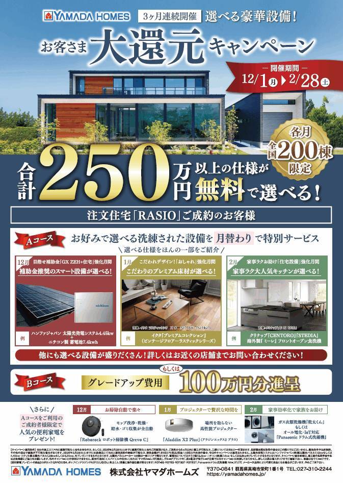 ・当特典は、ヤマダホームズ直営店でのみ実施しております。販売代理店「エスバイエルの住まい」「ヤマダホームズ代理店」では