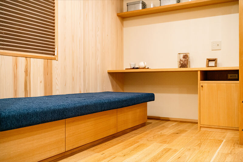 LDKに設けた「こもり部屋」LDKの一角に設けたDENは、家族の気配を程よく感じる場所。 扉を閉めれば、一人落ち着く空間に変わります。 デスクに向かって勉強に集中したり、ソファベンチでゆったりくつろいだり。 その時々の気分に合わせて自由に過ごせる場所です。 | ![]() |