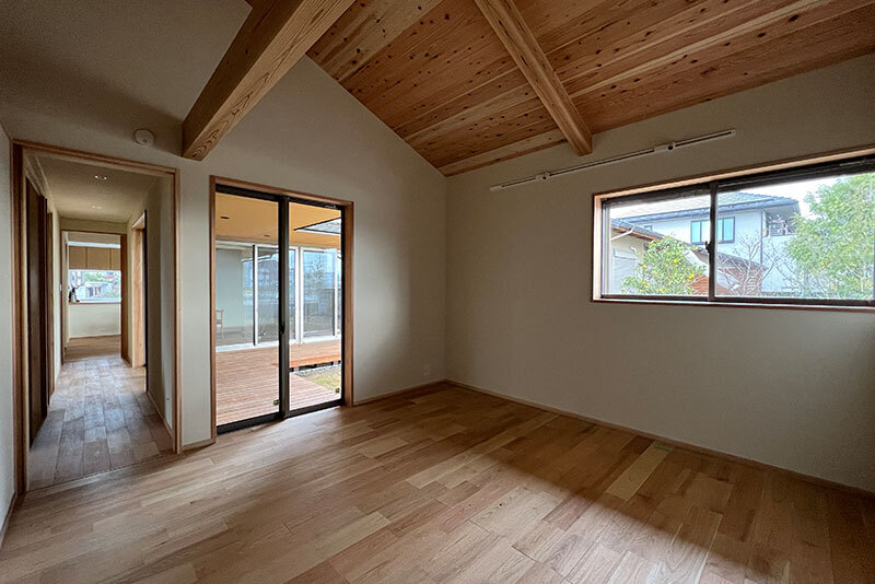 ![]() | お庭を感じる離れのような寝室1階に設けた寝室は、廊下を挟んでリビングから少し離れた場所に配置しました。 中庭へも直接出入りでき、プライバシーを守りながらも外とつながる開放的な空間です。 |