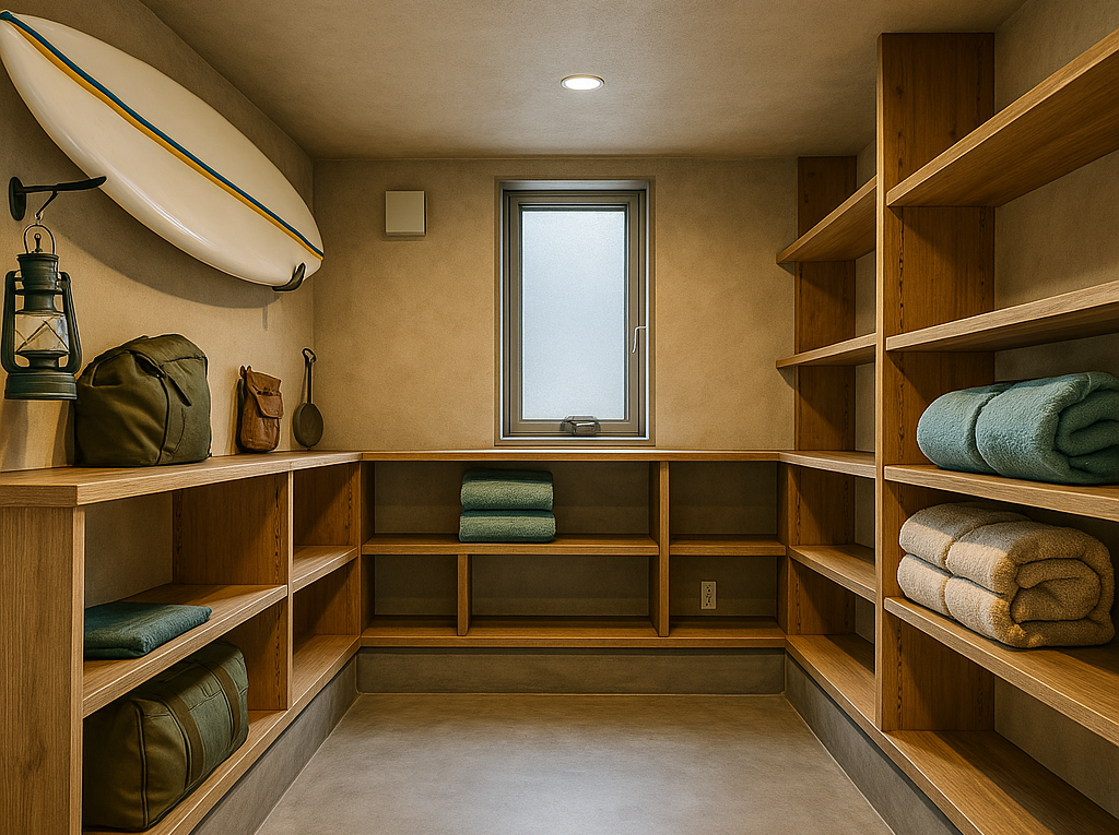 高低差を活かした土間収納には、サーフボードやアウトドア用品もすっきり収納。