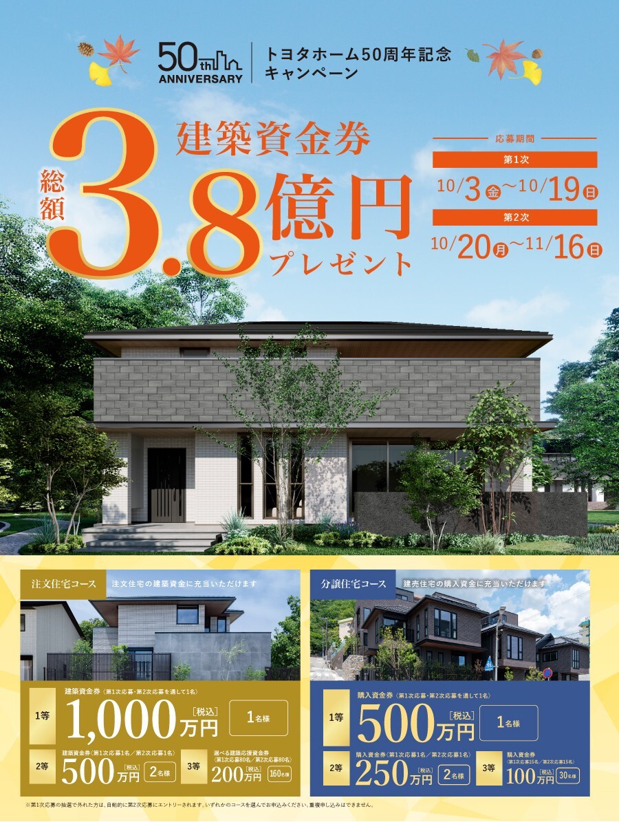 ●キャンペーン当選による建築または購入資金券利用は応募者本人に限ります。※ご当選者様以外の方への権利の譲渡や他の目的に使用することはできません。●建築または購入資金券は現金でお渡しすることはできません。また建物本体(分譲)価格が額面に満たない場合でも差額はお支払いいたしません。●建築または購入資金券は一時所得として税金がかかる場合がありますので、お客様の管轄の税務署へご確認ください。●注文住宅コースを お申込で、建築計画および敷地条件、その他の理由で建築が不可能な場合はお断りさせていただくことがございます(建築予定商品が該当敷地に建築可能か否かは、敷地調査のうえ判断させていただきます)。●トヨタホーム(株)およびトヨタホーム販売会社の他のキャンペーンとの併用はできません。
