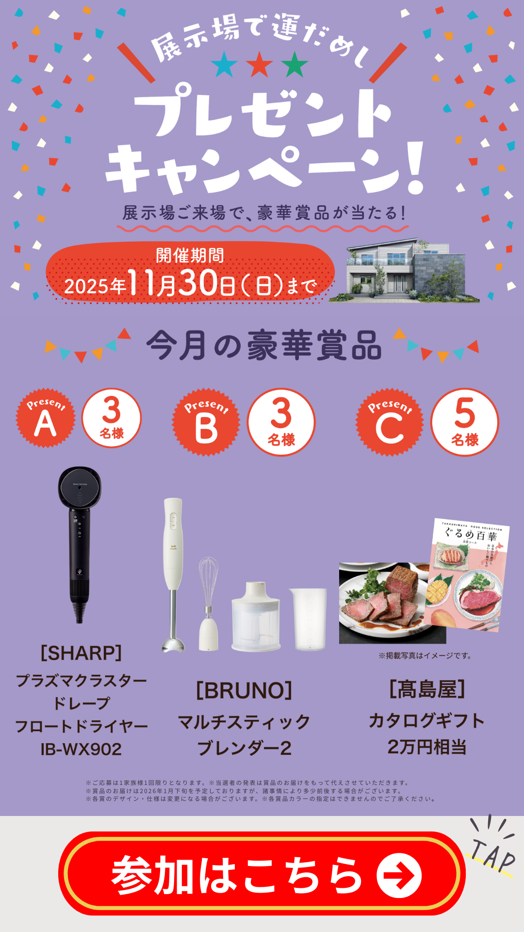 【期間限定!】BRUNOなどの豪華賞品が当たるチャンス🎉だれでも参加できる!展示場に来場するだけ🎁