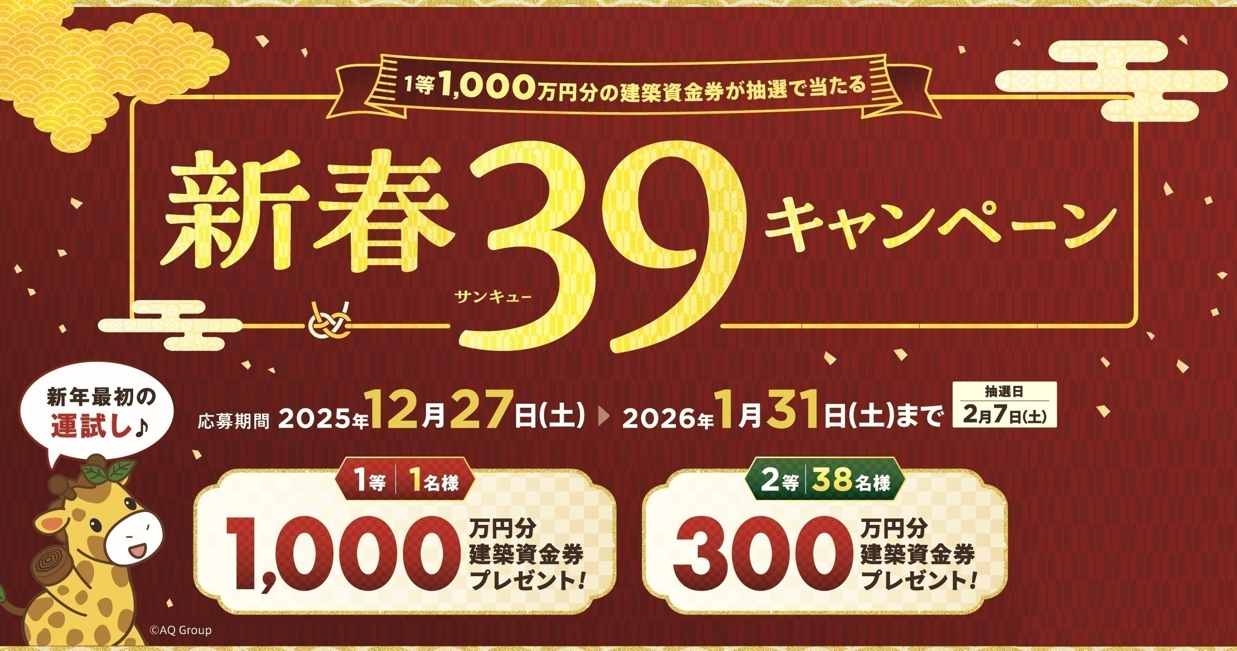 新春39(サンキュー)キャンペーン ◆キャンペーン概要◆ 期間中に応募いただいた方の中から抽選で新築注文住宅購入時に使える“建築資金券1,000万円分(税込)”を1等として1名様、“建築資金券300万円(税込)”を2等として38名様、合計39名様に進呈します。※建築資金券の使用について建物本体価格の8割までに充当でき、上限が1,000万円(税込)となります。<応募期間>・応募期間:2025年12月27日(土)~2026年1月31日(土)・当選発表:2026年2月7日(土)<応募条件・注意事項>●当選者様本人が2026年1月1日(木)~2月28日(土)までにAQ Group(アキュラホーム&FC加盟店・関連会社)と建築請負契約の締結かつ2027年2月28日(日)までに着工可能な方。●AQ Group(アキュラホーム&FC加盟店・関連会社)が建築可能な場所に居住用途の建物を建てることが可能な土地を所有するか、ご用意いただける方。※土地取得予定および借地も可。●建物本体工事価格は、施工地域・プラン・仕様などにより異なります。仕様は予告なく変更される場合があります。また、寒冷地など一部地域によって仕様が異なるか対応できない場合がございます。防火地域、準防火地域、旗状敷地、高低差のある土地、傾斜地、立地条件、プラン等によっては工事費に差額が生じる場合がございます。土地費用や建物外構工事・建物外付帯工事・諸手続費用・実費費用・諸費用等など標準設計以外の工事費や提案費用、設備仕様等費用は含まれておりません。●建物建築中から完成、引き渡し後にもAQ Group(アキュラホーム&FC加盟店・関連会社)のアンケートの回答やホームページ、SNSや実例集カタログ等のメディア媒体への掲載や撮影許可にご協力いただきます。●応募は1家族・1世帯・1敷地に1口のみで、建築し居住する20歳以上の本人に限ります。また、WEBまたはAQ Group(アキュラホーム&FC加盟店・関連会社)のモデルハウスにて受付となります。●契約者以外の方への適用権利の譲渡、金銭及び物品への引き換えはできません。●建築資金券が額面に満たない場合でも差額の支払いはできません。●建築資金券は一時所得として税金がかかる場合がある為、管轄の税務署にご確認をお願いいたします。●AQ Group(アキュラホーム&FC加盟店・関連会社)が実施する他のキャンペーン特典及び紹介や提携割引等との併用はできません。●該当敷地に建築可能か否かは、敷地調査の上、判断させていただきます。敷地条件や法的制約、その他の理由で建築が不可能な場合、適用できない場合があります。※詳しくは、AQ Group(アキュラホーム&FC加盟店・関連会社)の担当営業までお問い合わせください。【個人情報の取り扱いについて】AQ Group(アキュラホーム&FC加盟店・関連会社)は、応募されたお客様の個人情報はプライバシーポリシー(https://www.aqura.co.jp/privacy/)に掲げる利用目的の達成に必要な範囲で取得・利用をします。