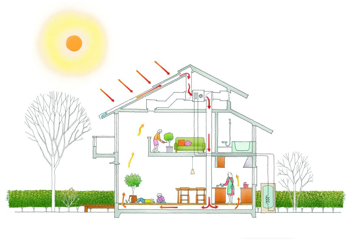 OMソーラーは、屋根で集めた太陽の熱を床下に送り込み、家全体を足元から温めるシステムです。