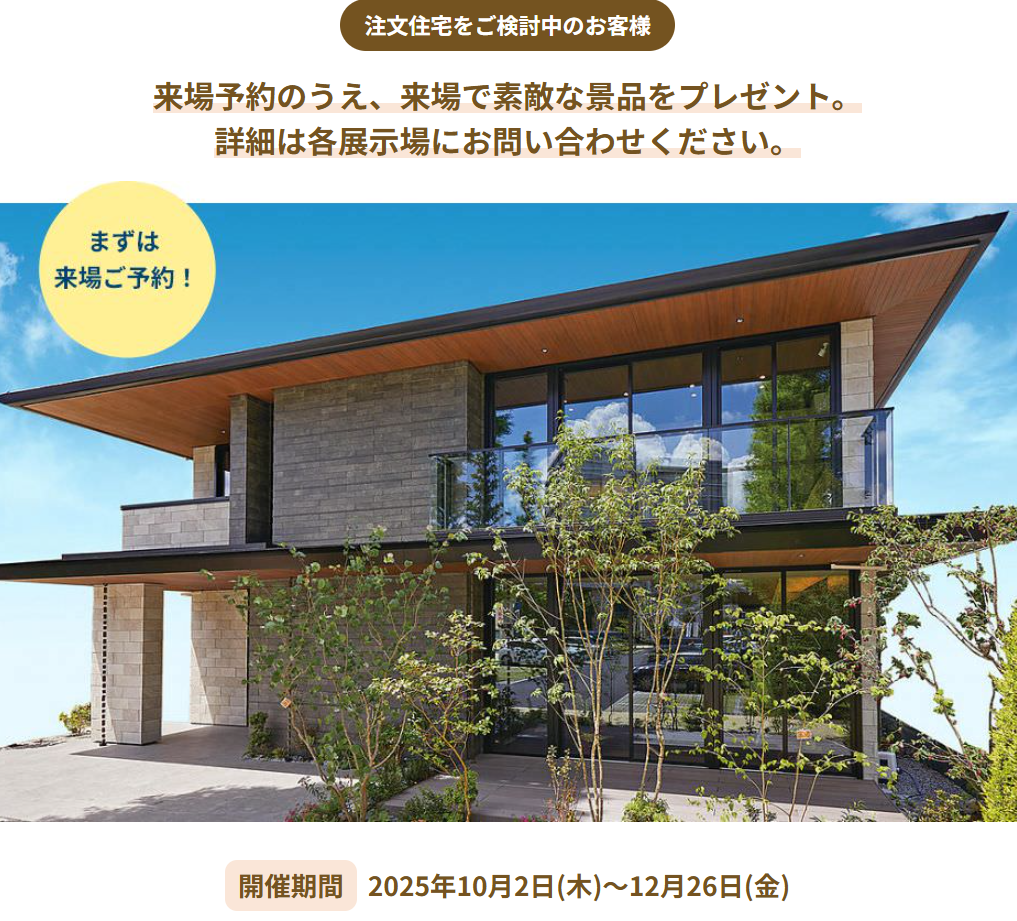 ※大和ハウスの公式WEBサイトから「住宅展示場」にご予約の上、ご来場いただいた方には「素敵な景品」をプレゼント。