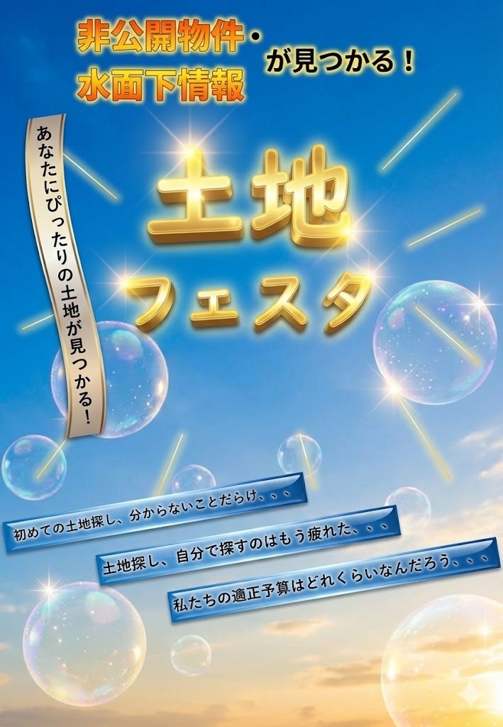 「土地フェスタ」開催中!! ーご希望エリアの非公開物件・水面下情報等、無料でお伝えいたします!ー