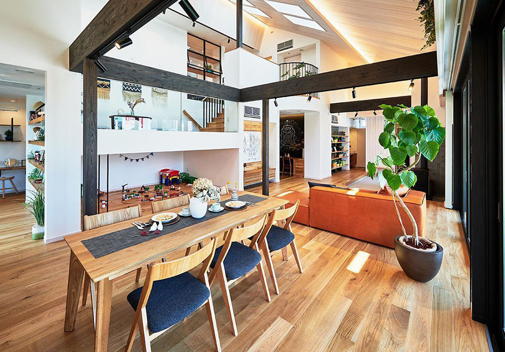 たとえば、切妻屋根の形状を生かして天井中央を高くすると、ロッジのような開放感あふれる雰囲気が出せます。意匠梁をつけると、ダイナミックさも加わりますね。