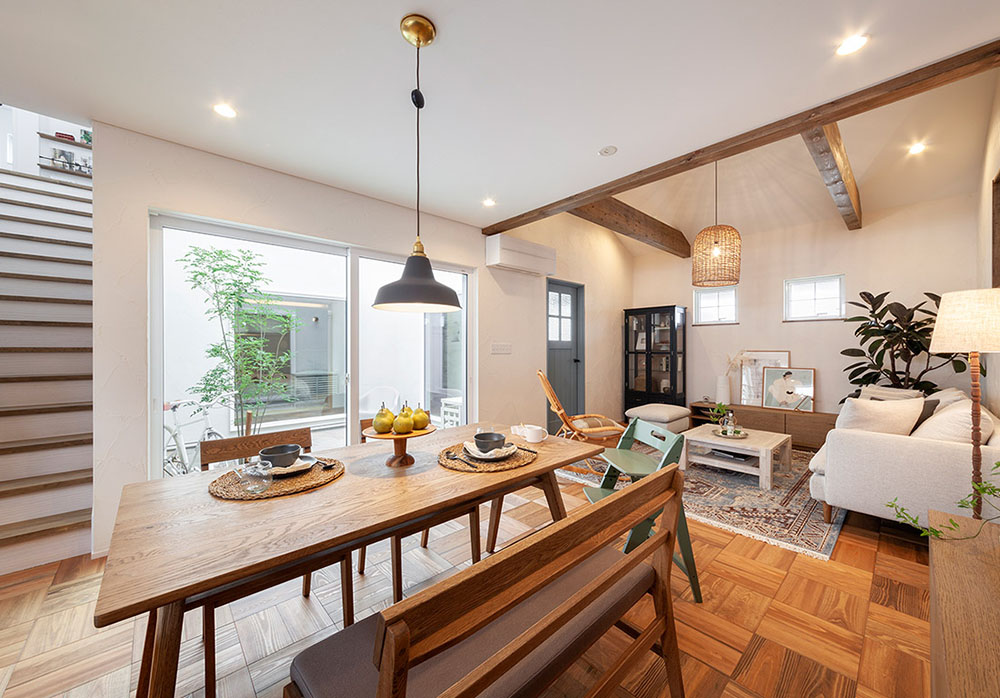 基本的に1階で過ごせるよう、生活動線をまとめたコンパクトな間取りが人気の事例です。LDKを勾配天井にして高さを出し、化粧梁でアクセントをプラス。中庭に面しているので、プライベートをしっかり守りながら採光や通風も確保できます。