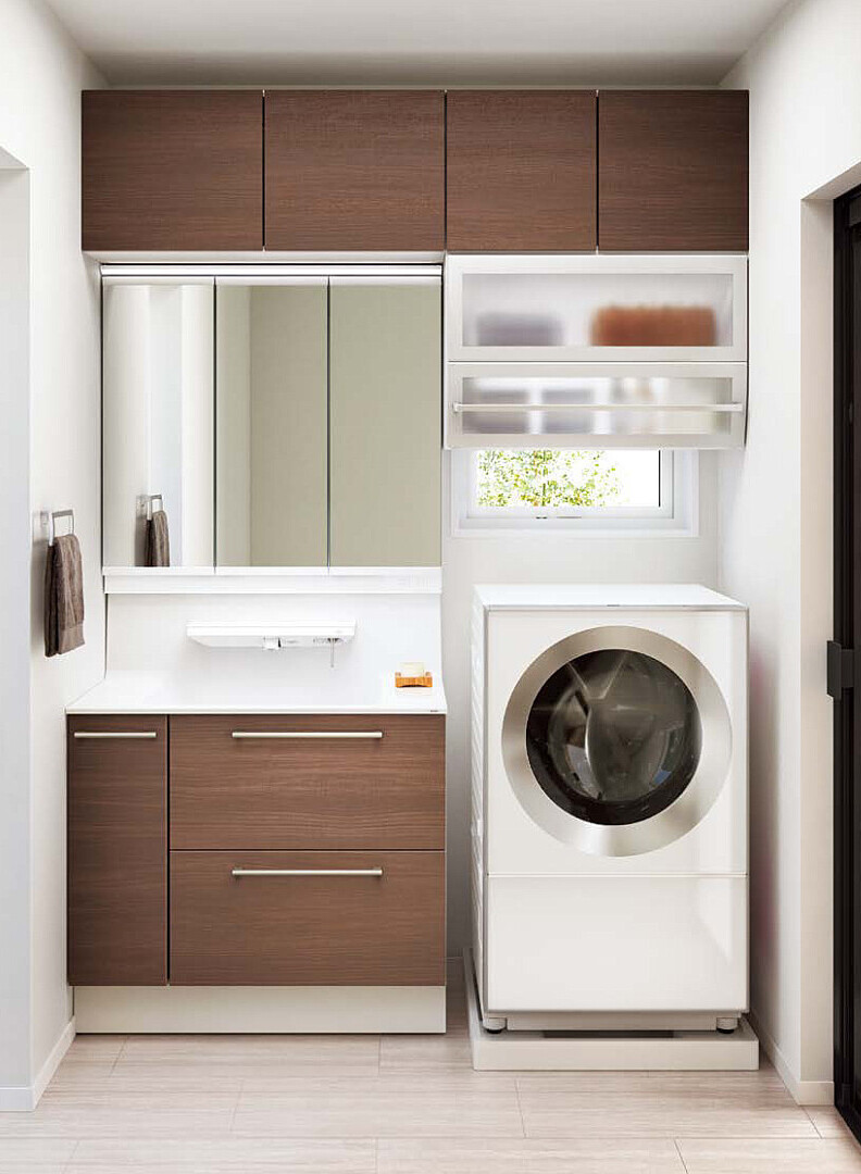 最低1坪あれば洗面化粧台と洗濯機を並べて配置できます。さらに広さを確保できる場合は、家事スペースとしてカウンターなどを設置する計画や、タオルや下着を片付けられる作り付けの収納を計画するプランも人気です。