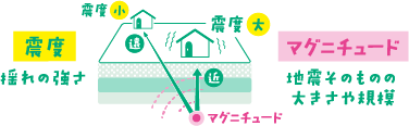「震度」は生活している場所での揺れの強さを、「マグニチュード」は地震の規模を表します。例えば、マグニチュードが同じでも、震源からの距離が近い場合は震度が大きく、遠い場合の震度は小さくなります。
