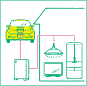 電気自動車の中には、蓄電池としても利用できる車種が。停電時には、蓄電していた電気を使って、家庭内の電力として利用できる。