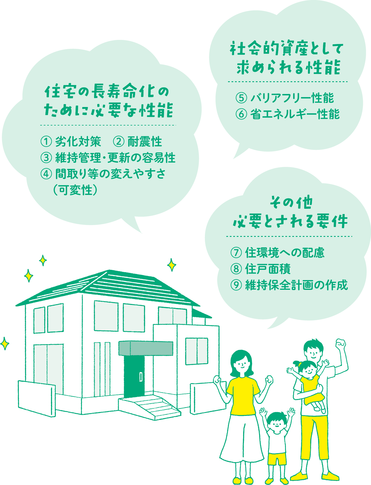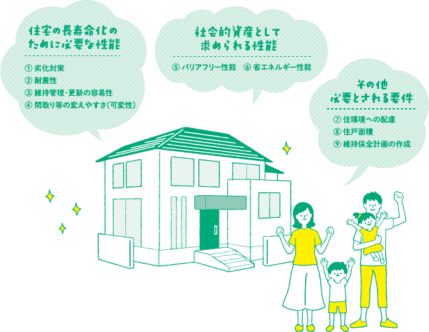 2009年に施行された「長期優良住宅の普及の促進に関する法律」で定められている、耐震性、耐久性能、維持管理・更新の容易性、住戸面積…など、9つの項目の基準や条件を満たした、高い性能が備わった住宅のこと。丈夫で長持ちし、快適な住まいである証しです。