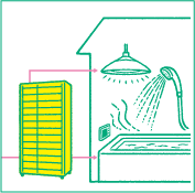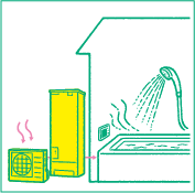 空気を圧縮し、熱を生み出す「ヒートポンプ技術」を採用した給湯器。停電、断水時でも、お湯を取り出して生活用水として使用できる。