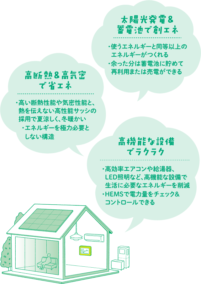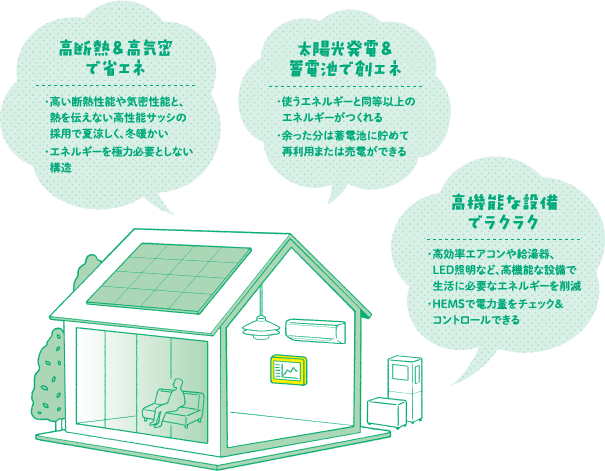 「ZEH(ネット・ゼロ・エネルギー・ハウス)」とは、高い断熱性能と気密性能によってエネルギーの消費を抑え、太陽光発電システムや蓄電池、エコキュートなどによる創エネで、消費を上回るエネルギーをつくり出せる住まいのこと。また、それらの性能やシステムは、地震などによる自然災害でライフラインが停止した時にも活躍する、災害時に強い住まいです。