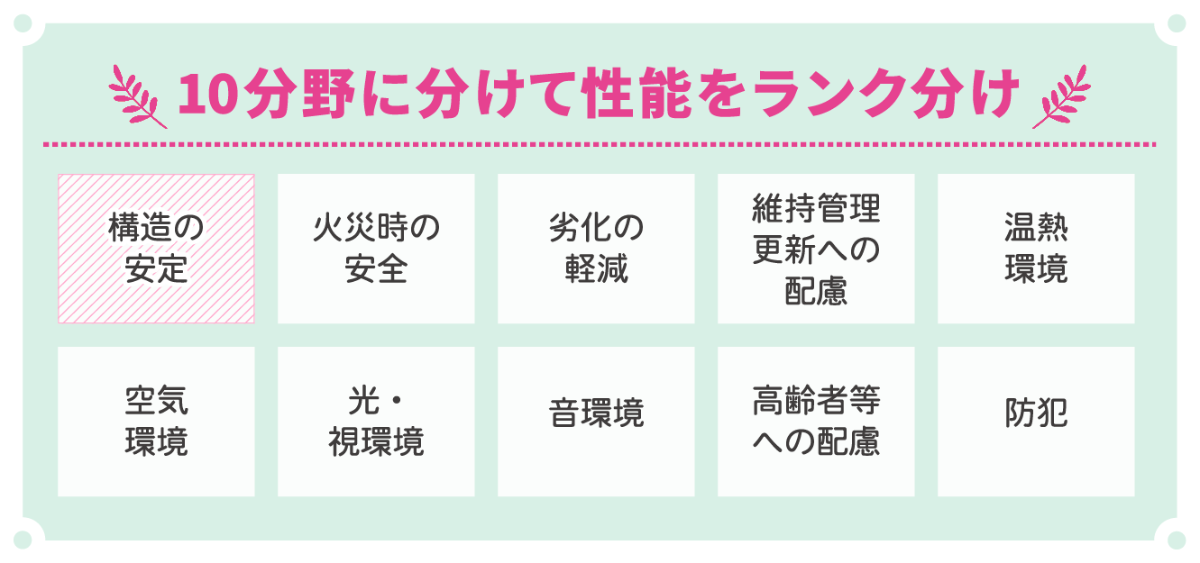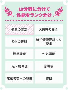 「住宅性能表示制度」は、2000年に施行された「住宅の品質確保の促進等に関する法律(品確法)」に基づき、住宅の性能を共通の基準で評価する制度。たとえば、地震に対する強さや性能は、“構造の安定”という分野の中で耐震等級として表され、その等級によって、建築物の倒壊や崩壊のしにくさなどが判断できます。