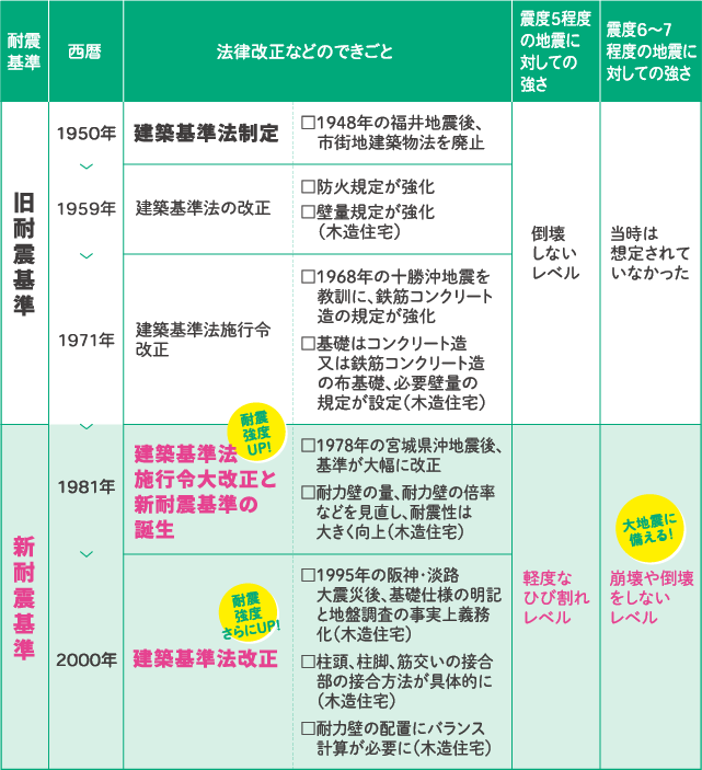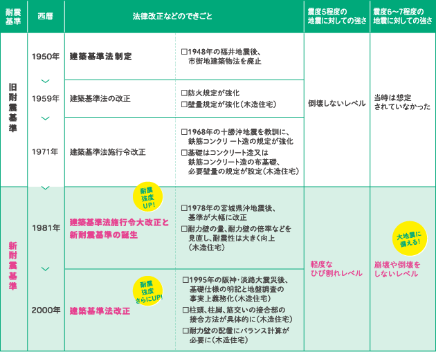 建築基準法の中で定められている「耐震基準」は、国内で大きな地震などが起こるたびに改正されてきました。宮城県沖地震後の1981年6月には、それまであった耐震基準を見直して、震度6〜7に対抗できる強度が求められる「新耐震基準」が誕生。さらに、阪神・淡路大震災後の2000年にも改正が行われるなど、地震に強い住まいづくりのための基準へと進化しています。