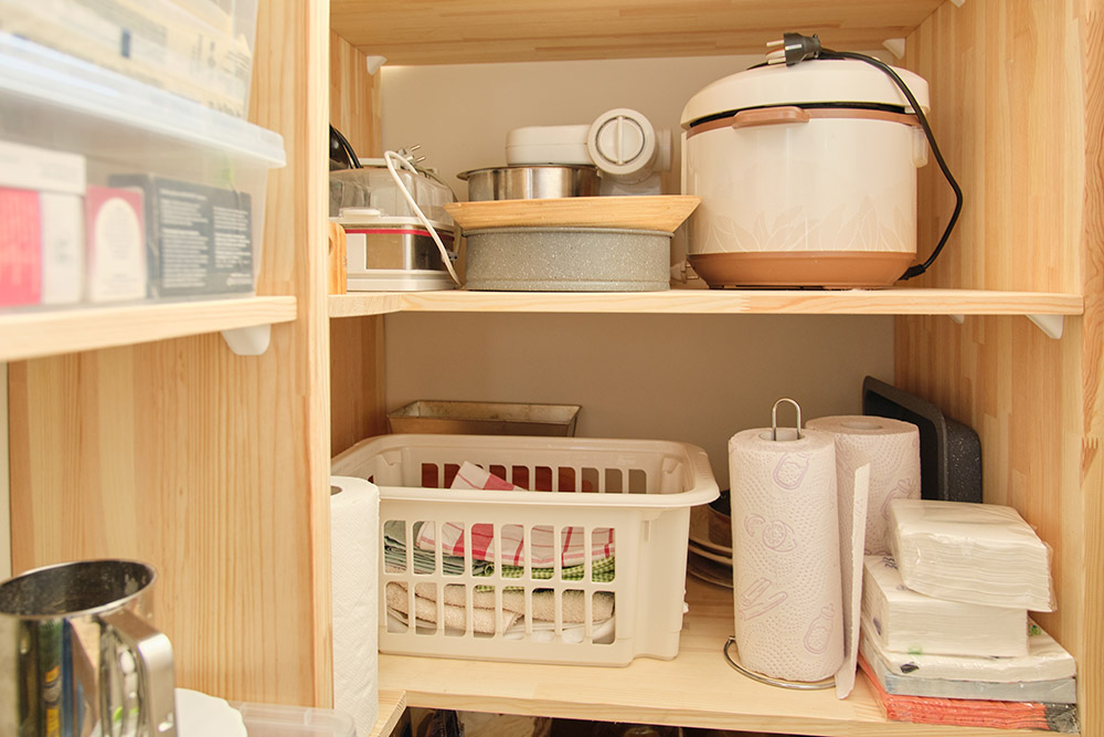 パントリーをつくる際に、あらかじめ固定式の棚を設ける場合もありますが、思いのほか使いにくかったという声が多いのです。例えば家電調理器などの収納幅に合わせて奥行きのある棚を作ると、奥に収納したものを見つけにくくなるといった具合に思わぬ不具合が生じることもあります。