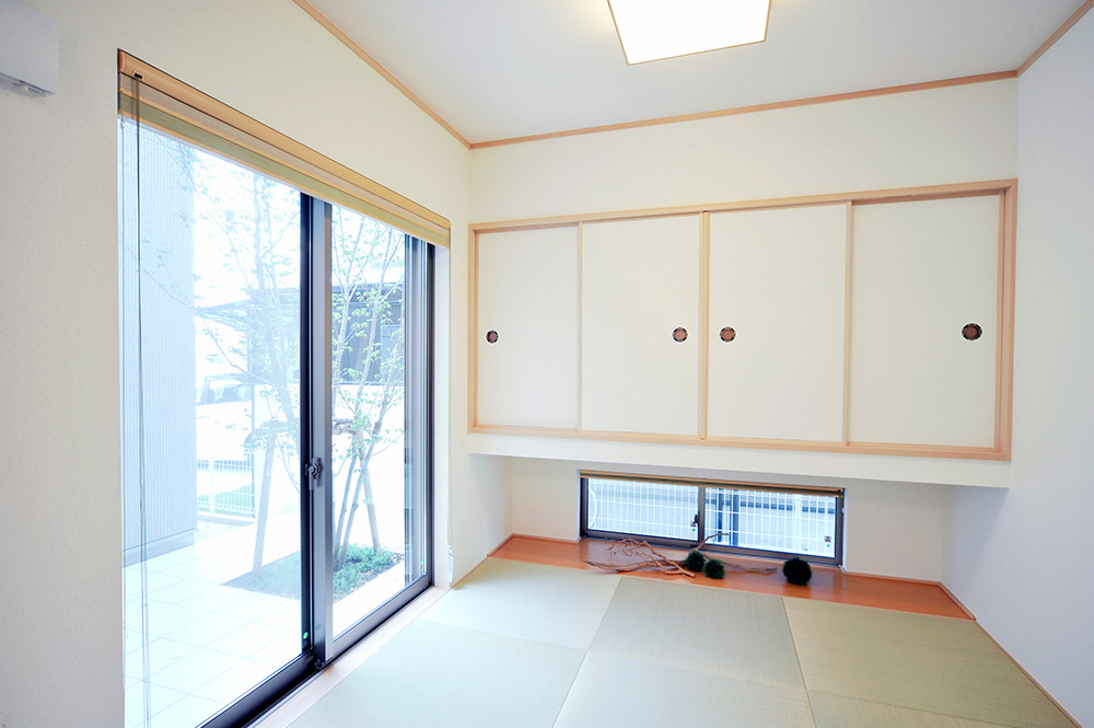 こちらの和室は壁や天井・収納も洋風でリビングの雰囲気にもぴったり合っています。畳の周りの板張りはフローリングの色に合っているので一体感のある空間になっています。
