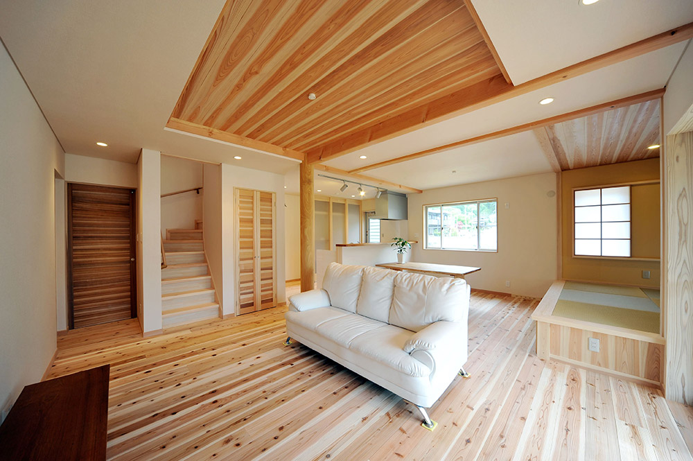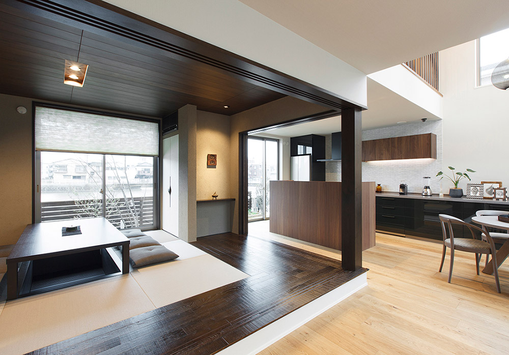 フローリングだけのリビングの中に、質感の異なる畳スペースがあることで、空間にメリハリと高級感が生まれます。