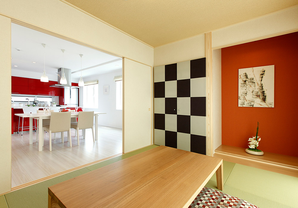 こちらは床の間に朱色と市松模様の一面貼りで個性的な雰囲気の和室に仕上がっています。キッチンの赤と床の間の朱色がリンクし、個性を出しながらも連続した色の繋がりがあります。ふすまを閉めてしまえば個室として使い勝手のいい空間になっています。