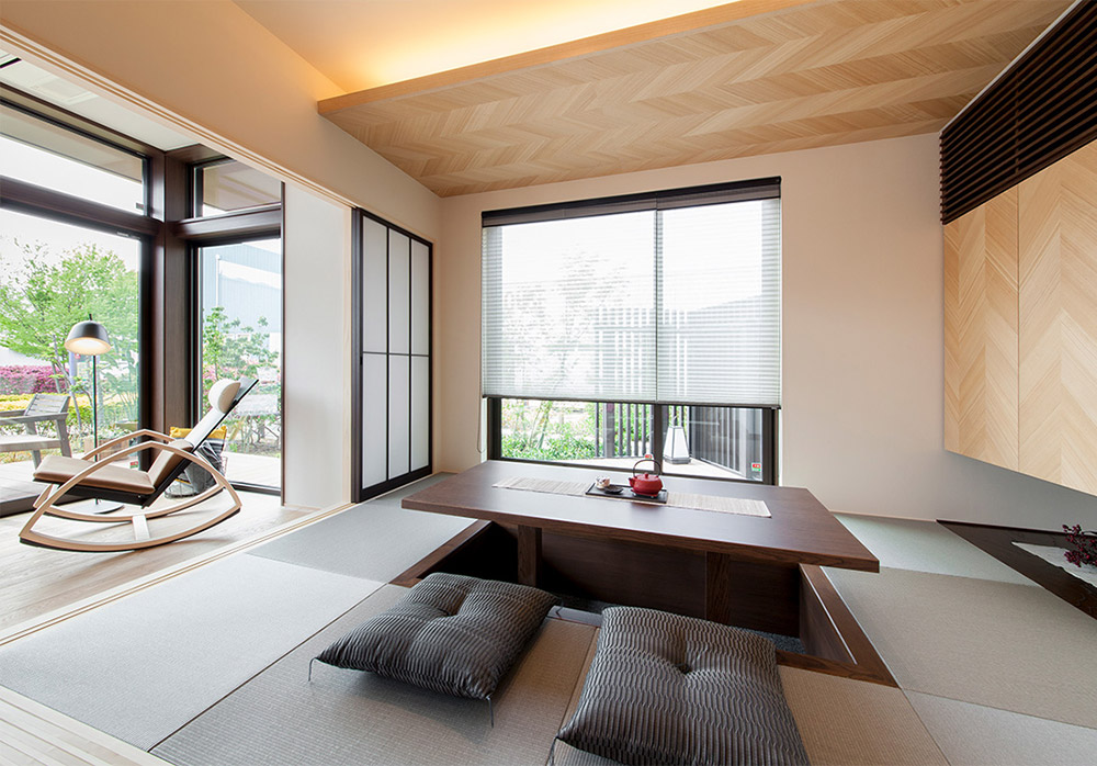 掃き出し窓やリビングからの光が降り注ぐ明るい和室。掘りごたつを使ったゆったりと落ち着いた空間で、いつまでもおしゃべりしていたくなる空間に仕上がっています。和紙風のロールスクリーンは洋風和室にも人気のアイテムです。
