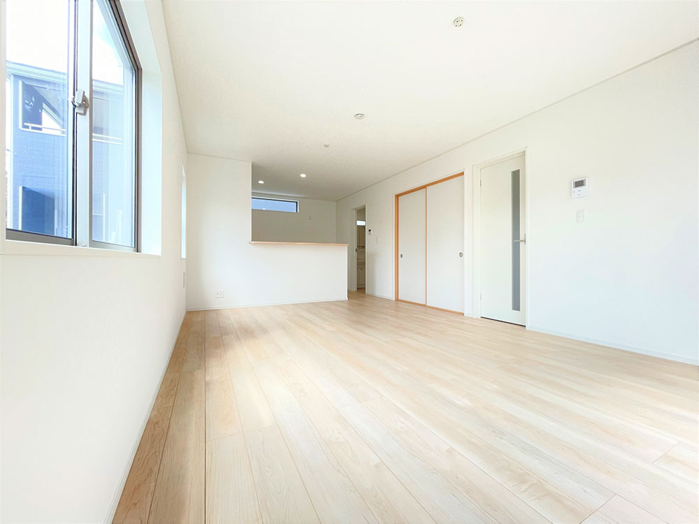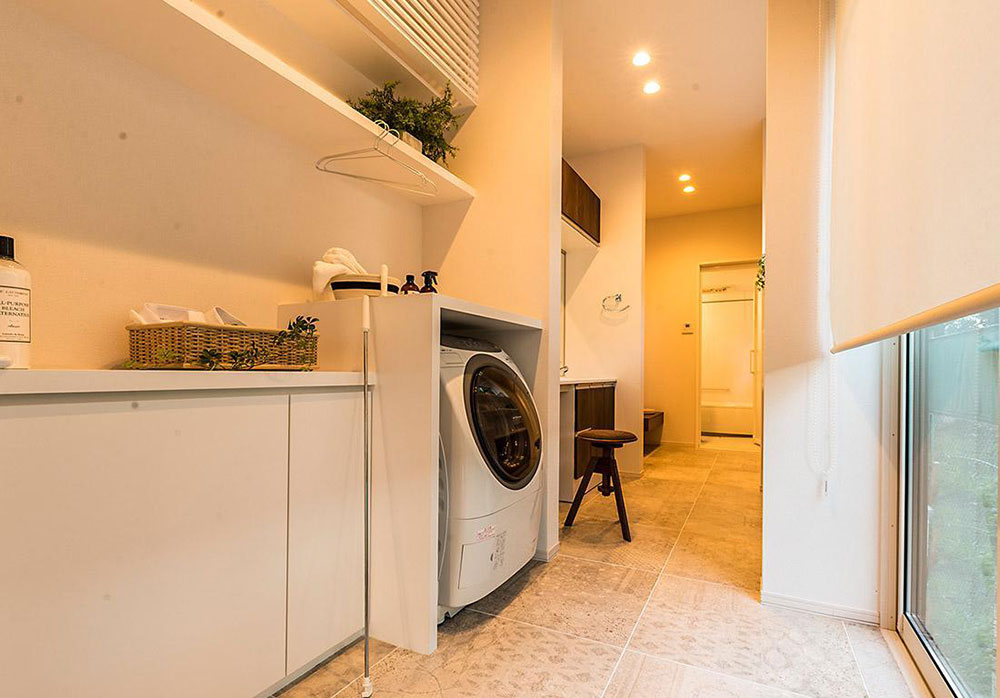 LDKからサニタリースペース、浴室までスムーズに回遊できる間取りで家事も掃除も時短できるよう設計された家。床面の凹凸が少ないので、床掃除も手早く済ませられそうです。ナチュラルな色柄のフロアタイルを選び、インテリア性も両立しています。