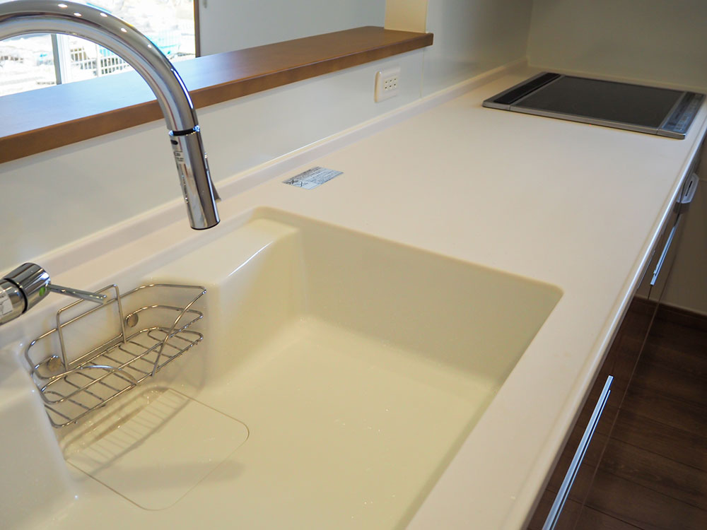 人造大理石はステンレスに比べると傷が入りやすいので、スポンジなどやわらかいもので掃除するのが基本ですが、抗菌材を練り込んで成形しているタイプもあり、そういったものを選べば衛生的に保ちやすくなります。ステンレスと人造大理石のどちらを選ぶ場合でも、ワークトップとシンクを同一素材で揃えると、ワークトップとシンクの接合部分に段差ができにくく、掃除がしやすくなります。