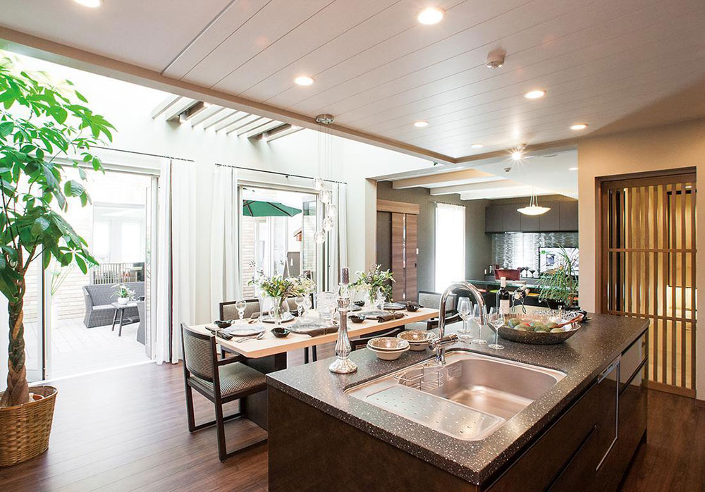 家の中心に設けた中庭は、セカンドリビングとして家族団らんの場に。風が通りやすい窓の配置によって、風通しは抜群です。和室は吊り押入にして、押入下部に窓を設けており、心地よい風が通ります。湿気がこもってカビが生えやすい立地であれば、こうした工夫をすることでインテリア性を保ちながら掃除しやすい家にすることができます。