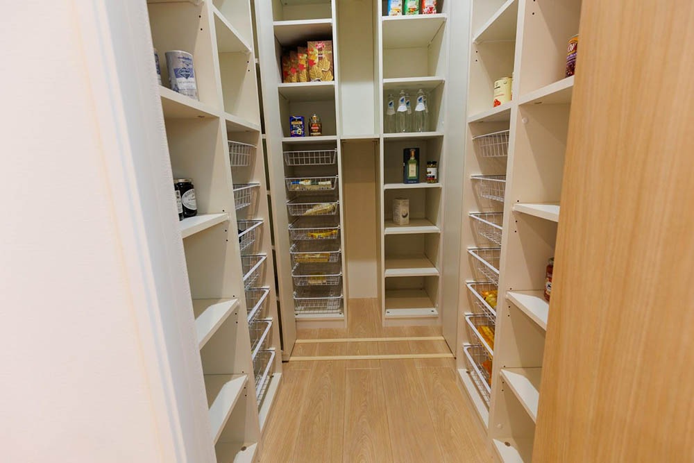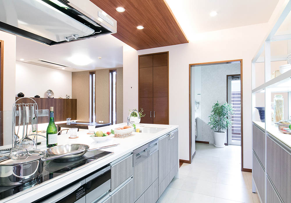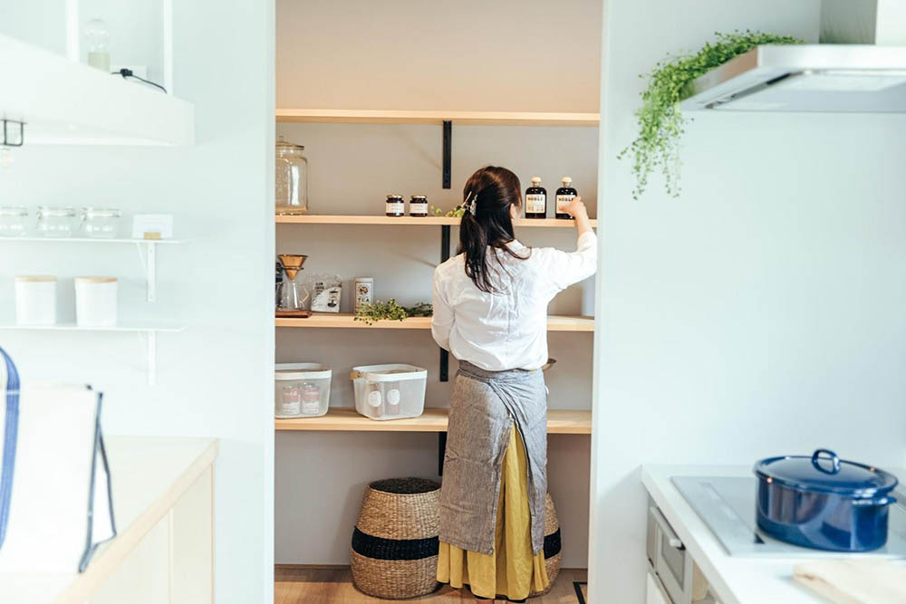 キッチンに隣接するパントリーは、食品や調理器具、掃除道具などをまとめて収納できます。キッチンの作業スペース上のものが減って、調理がスムーズになります。