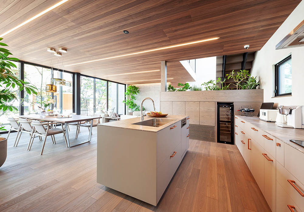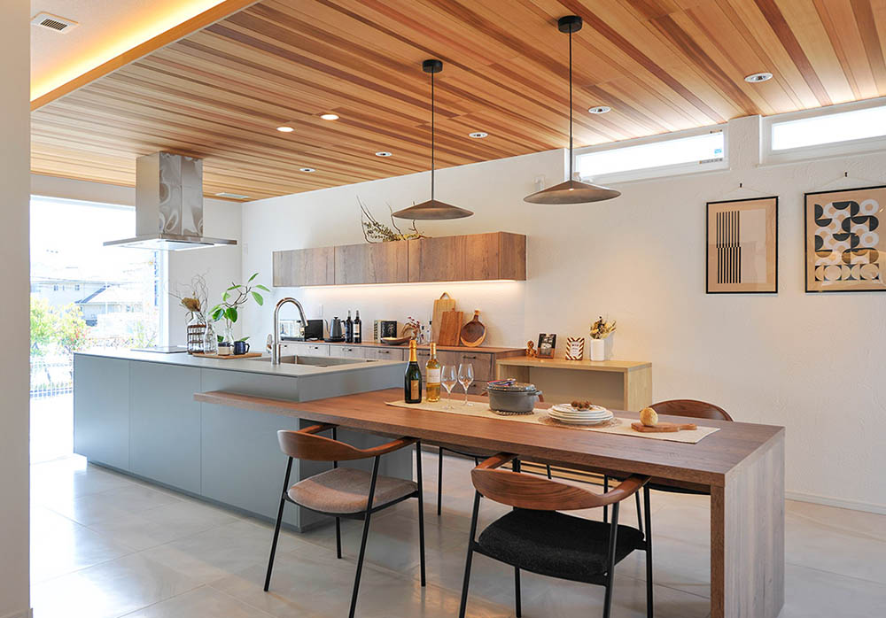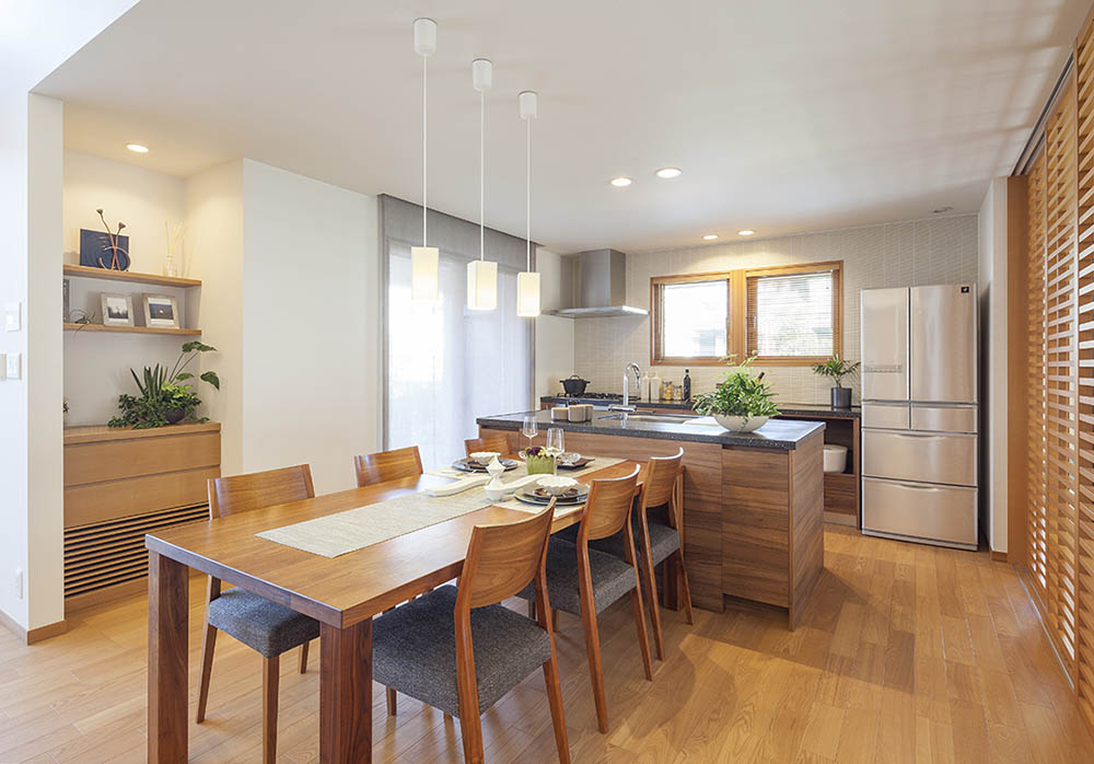 カウンターキッチンとダイニングテーブルを並列させる
