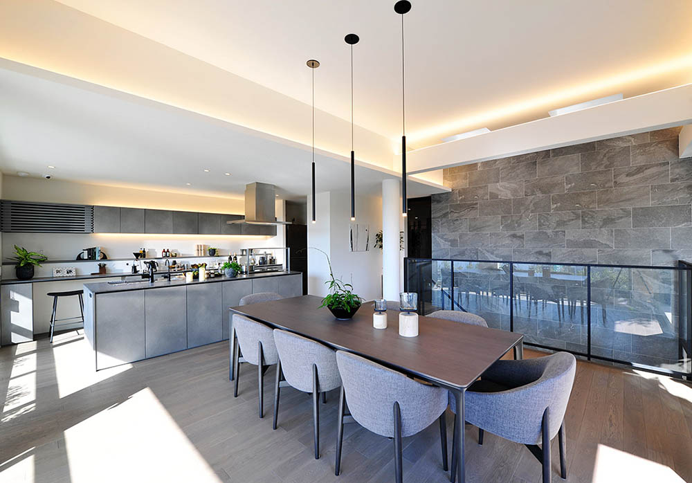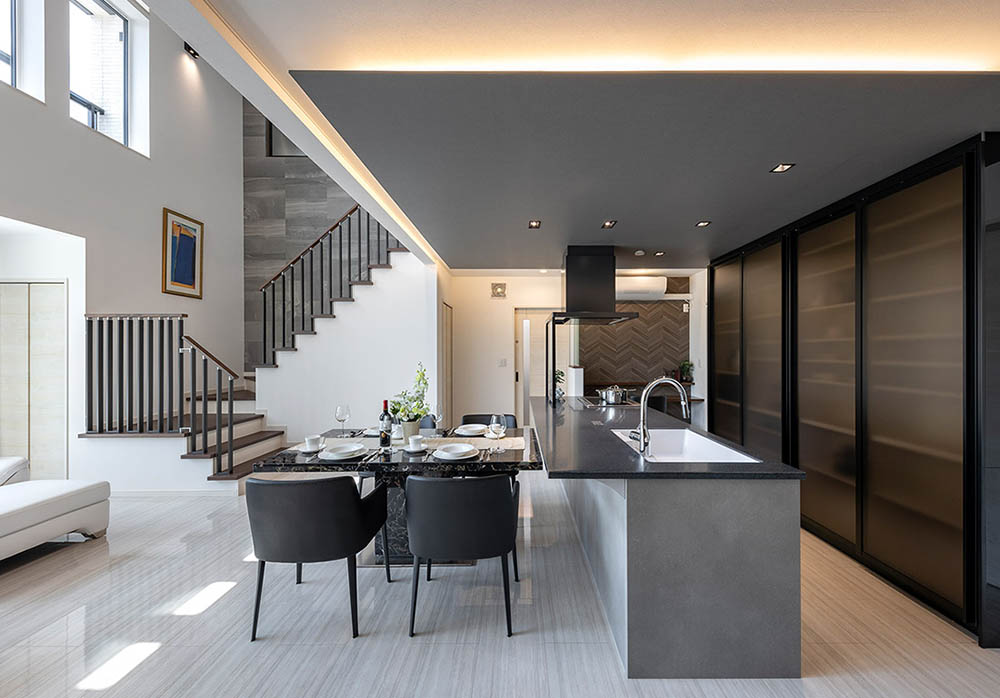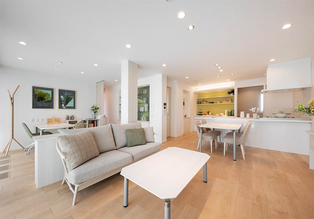 十分な広さのある24畳のLDKの場合、レイアウトの選択肢が広がります。この事例では、LDKそれぞれのスペースがすっきりと際立っています。余白のスペースがあっても、バラバラな雰囲気ではなく一体感をもって感じられるのは、カウンターキッチンの開放感によるものです。それぞれのスペースに心地よい距離感があるので、家族でコミュニケーションを取りたい場合でも、同じ空間にいながら思い思いに自分の時間を過ごしたい場合でも快適な時間を過ごせることでしょう。