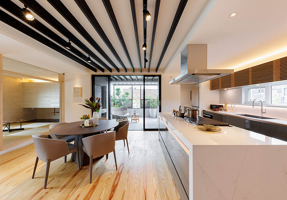 先ほどほぼ同じ広さのLDK24畳の事例です。こちらでは、キッチンスペースを広めに取って、大きな背面収納と奥行きの広い大きなカウンターキッチンを配置しています。ダイニングキッチンとリビングに分けられた間取りですが、シンク側に格子状の間仕切り壁を採用している点がポイントです。視線が通ることでキッチンとリビングのつながりが生まれ、LDK全体の一体感が高められています。