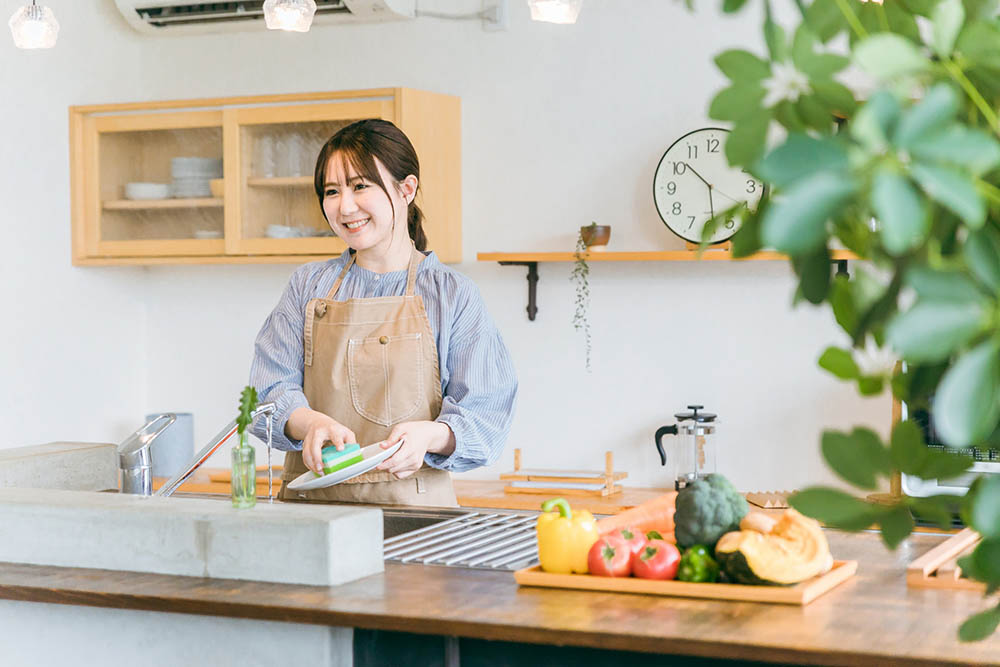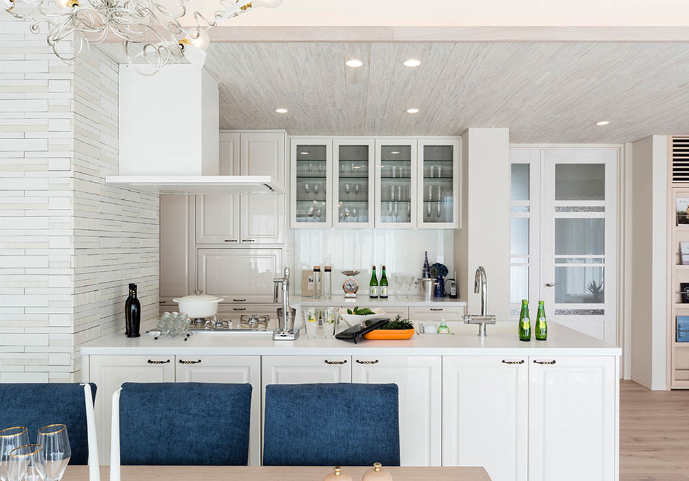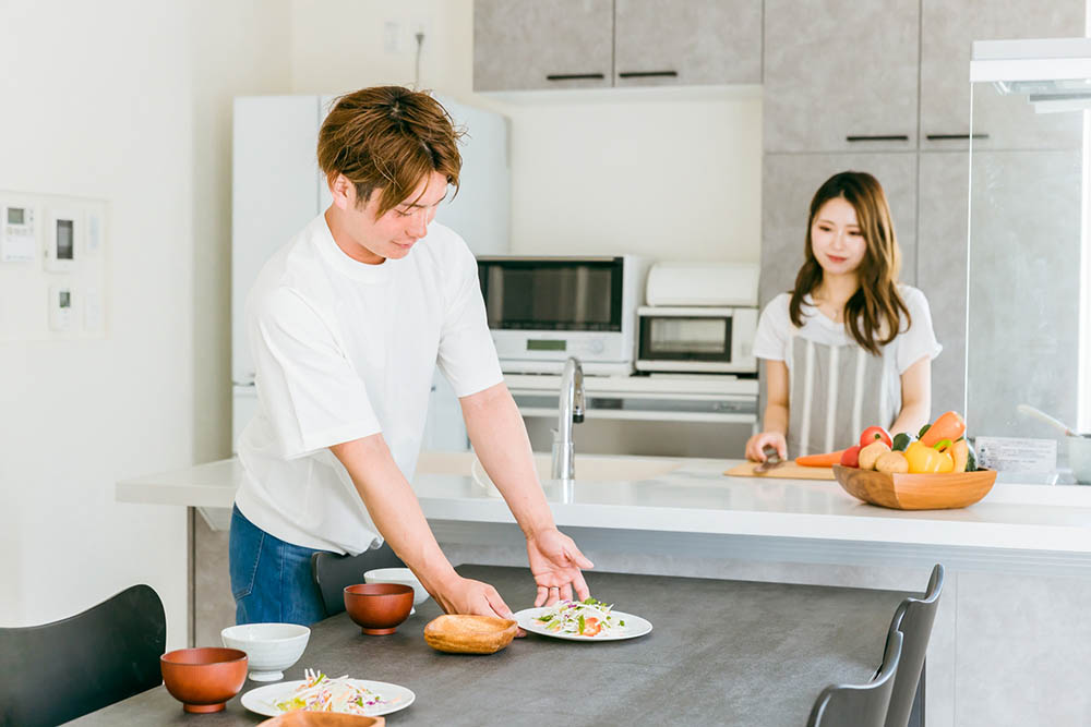 カウンターキッチンは、調理した料理をカウンターに並べてダイニング側から受け取りができます。料理を載せた皿の持ち運びが不要なので、食事の配膳や片付けが非常に効率的です。家族が多い場合やホームパーティをする際など、食器をたくさん使う時には、その便利さを特に実感できます。