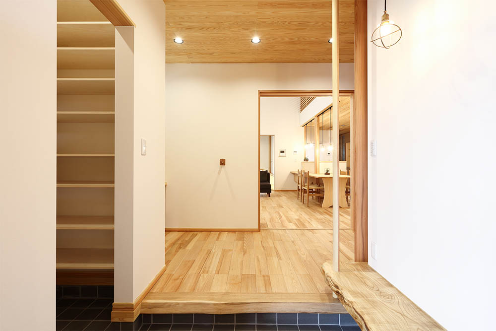 玄関から直接リビングへつながる来客用動線と、シューズクローゼットやパントリーを通ってキッチンなどへアクセスできる家族用動線を分けることで、常に玄関をすっきりと保つことができます。お客様には整頓された印象を与えつつ、家族は散らかることなくスムーズに動ける、実用性と美しさを両立したアイデアです。