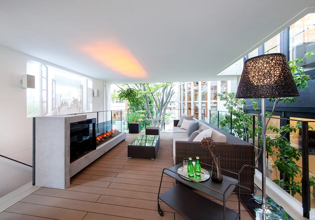 我が家と同じく、テラスに暖炉を設置した事例。屋内とフルフラットで繋がり、一体感があります