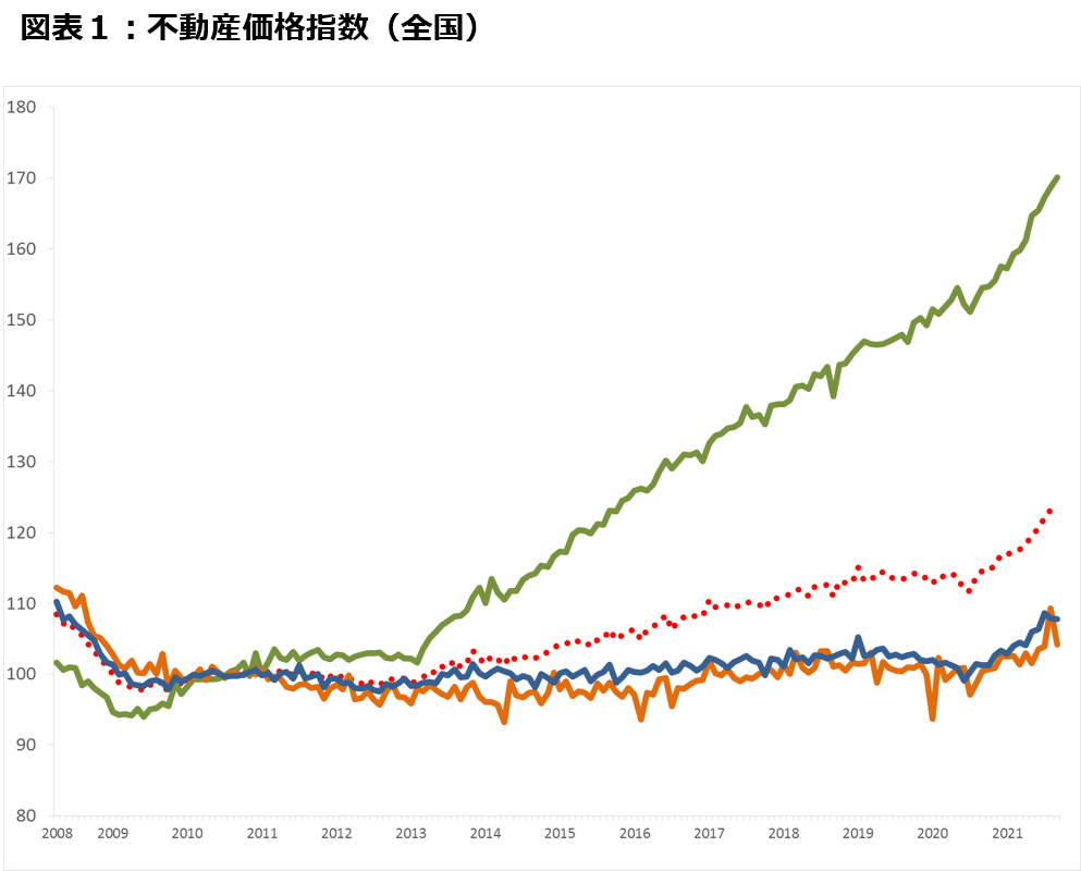 「東京オリンピックが終わると不動産価格が下がる」と言われたこともありました。また新型コロナウイルス感染拡大が、不動産価格にどう影響しているのか気になる人も多いのではないかと思います。そこで国土交通省から発表されている「不動産価格指数」の推移を見ることにします(図表1)。