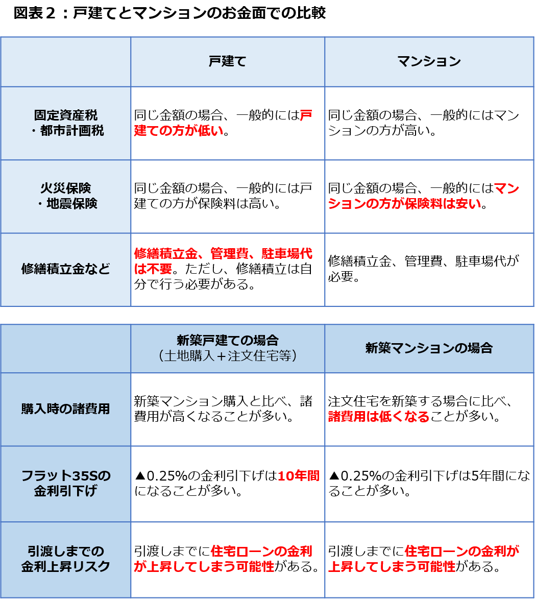 ここからは、戸建てとマンションを購入する場合の、お金面での違いについてまとめます。主な違いは図表2にまとめたとおりです。